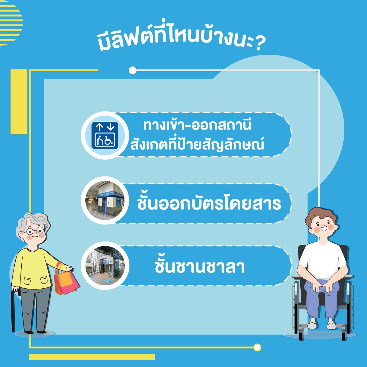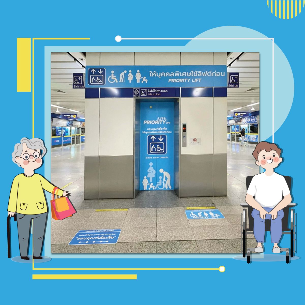 บริษัท ทางด่วนและรถไฟฟ้ากรุงเทพ จำกัด (มหาชน) หรือ BEM รณรงค์เชิญชวนผู้ใช้บริการให้ความสำคัญและดูแลผู้โดยสารกลุ่มบุคคลพิเศษ ได้แก่ ผู้สูงอายุ ผู้พิการ สตรีมีครรภ์ และผู้มีรถเข็นเด็ก เพื่อให้สามารถใช้บริการอย่างสะดวกและปลอดภัยเป็นลำดับแรก ด้วย “Priority Lift” ลิฟต์ภายในสถานีสำหรับบุคคลพิเศษ โดยรถไฟฟ้าสายเฉลิมรัชมงคล หรือสายสีน้ำเงิน (Blue Line) ดำเนินการแล้ว 5 สถานี ได้แก่ สถานีสวนจตุจักร สถานีลาดพร้าว สถานีสีลม สถานีวัดมังกร และสถานีหลักสอง
