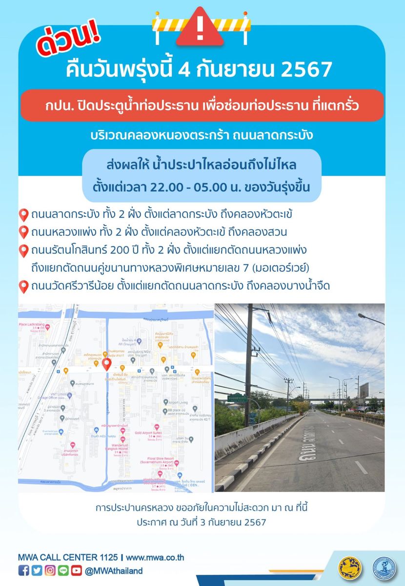 การประปานครหลวง (กปน.) มีความจำเป็นต้องปิดประตูน้ำท่อประธานขนาดเส้นผ่านศูนย์กลาง 1,200 มิลลิเมตร เพื่อซ่อมท่อประธาน ที่แตกรั่ว บริเวณคลองหนองตระกร้า ถนนลาดกระบัง ในคืนวันพรุ่งนี้ (วันพุธที่ 4 กันยายน 2567) ตั้งแต่เวลา 22.00 - 05.00 น. ของวันรุ่งขึ้น เพื่อให้ประชาชนได้รับบริการน้ำประปาอย่างเพียงพอและทั่วถึง โดยระหว่างดำเนินการ ส่งผลให้ น้ำประปาไหลอ่อนถึงไม่ไหล ในพื้นที่ดังต่อไปนี้