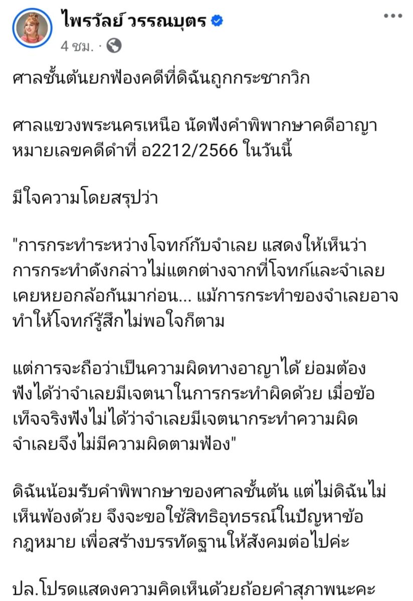 ด้าน แพรรี่ ได้โพสต์ข้อความผ่านทางเฟซบุ๊ก ระบุว่า ดิฉันน้อมรับคำพิพากษาของศาลชั้นต้น แต่ไม่ดิฉันไม่เห็นพ้องด้วย จึงจะขอใช้สิทธิอุทธรณ์ในปัญหาข้อกฎหมาย เพื่อสร้างบรรทัดฐานให้สังคมต่อไปค่ะ