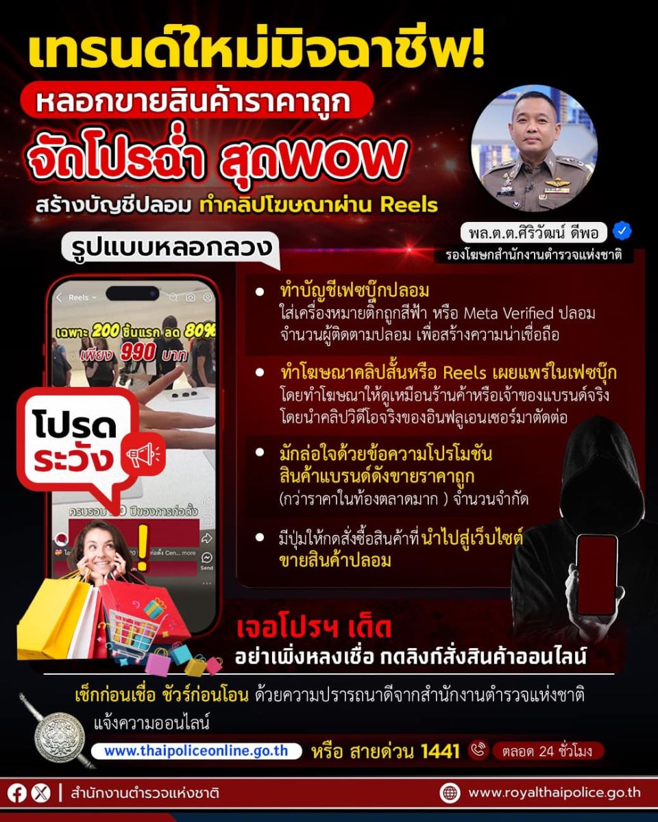 วันนี้ ( 8 กันยายน 2567) สำนักงานตำรวจแห่งชาติ พบกลุ่มมิจฉาชีพมีการพัฒนารูปแบบวิธีการในการหลอกลวงประชาชน จากเดิมที่มิจฉาชีพจะลงโฆษณาหลอกขายสินค้าราคาถูกผ่านโพสต์ในสื่อสังคมออนไลน์ เปลี่ยนเป็นการโฆษณาผ่านการลงคลิปสั้น หรือ Reels ในเฟซบุ๊ก โดยมิจฉาชีพจะสามารถใส่ปุ่มให้กดซื้อสินค้า ซึ่งเป็นลิงก์ที่จะนำไปสู่เว็บไซต์ขายสินค้าปลอม