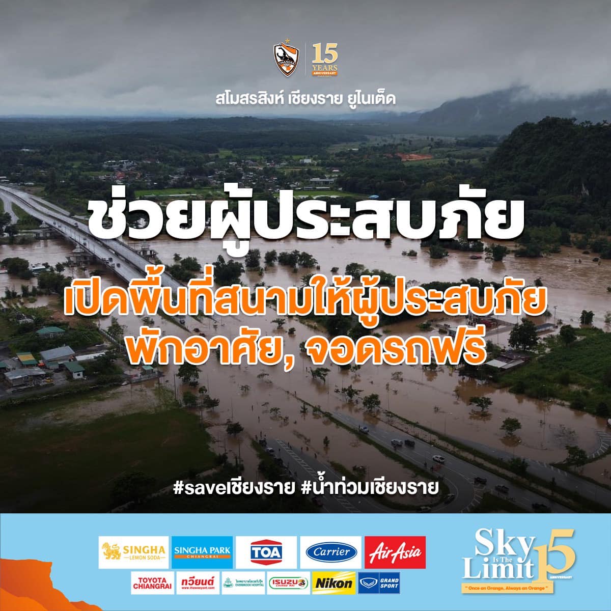 ล่าสุด “ประธานฮั่น” มิตติ ติยะไพรัช ประธานสโมสรเชียงรายยูไนเต็ด ได้โพสต์ข้อความผ่านทางเฟซบุ๊ก สำหรับวันนี้ผู้ประสบภัยเร่งด่วนที่ไม่มีที่พัก ฟรี!!! ทางสโมสรมีห้องพักรวมไม่ได้แยกชายหญิง ฟรี!! เปิดให้เข้าพักได้จำนวน 64 คน มีเตียง มีหมอน ผ้าห่ม มีห้องอาบน้ำ มีล็อคเกอร์ มีห้องน้ำ และเครื่องซักผ้า ไม่มีผ้าเช็ดตัว ตอนนี้พร้อมบริการแล้ว ฟรี!!! สามารถติดต่อสโมสรได้ที่เบอร์ 0631637494, 0624024188 #saveเชียงราย #น้ำท่วมเชียงราย