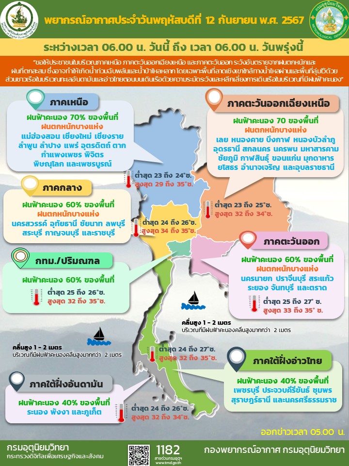 ลักษณะอากาศทั่วไป วันที่ 12 กันยายน 2567 พยากรณ์อากาศ 24 ชั่วโมงข้างหน้า ร่องมรสุมพาดผ่านภาคเหนือตอนบนและภาคตะวันออกเฉียงเหนือตอนบน เข้าสู่หย่อมความกดอากาศต่ำบริเวณประเทศเวียดนามตอนบนและอ่าวตังเกี๋ย ประกอบกับมรสุมตะวันตกเฉียงใต้กำลังปานกลางพัดปกคลุมทะเลอันดามัน ประเทศไทย และอ่าวไทยตอนบน