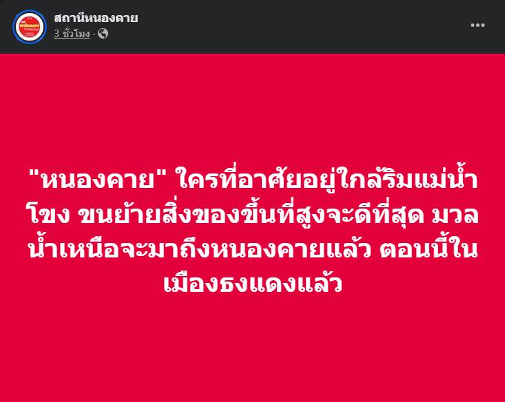วันที่ 12 กันยายน 2567 เพจ สถานีหนองคาย ระบุ เทศบาลเมืองหนองคาย อ.เมือง จ.หนองคาย เร่งระบายน้ำที่ขังอยู่ตามท่อบริเวณพื้นที่ในตัวเมืองหนองคาย เพื่อรองรับปริมาณน้ำฝนที่จะตกมาสมทบกับน้ำโขงที่หนุนสูงและซึมเข้ามาตามท่อระบายน้ำ โดยทางเทศบาลเมืองหนองคายได้ติดตั้งเครื่องสูบน้ำขนาดใหญ่ ทั้งหมด 8 จุดหลักๆ บางจุดเครื่องสูบน้ำได้เร่งผลักดันน้ำลงสู่แม่น้ำโขง จุดหน้าวัดลำดวน จุดหน้าวัดหายโศก และจุดห้วยวังฮู จุดดังกล่าวระดับน้ำในท่อถึงหัวกะโหลกแล้ว และได้ปิดประตูระบายน้ำในเมืองหนองคาย ทั้งหมด 11 จุด เครื่องสูบน้ำบางจุดยังไม่สูบน้ำเพราะจุดนั้นระดับน้ำยังไม่ถึงหัวกะโหลกที่จะสูบออกได้
