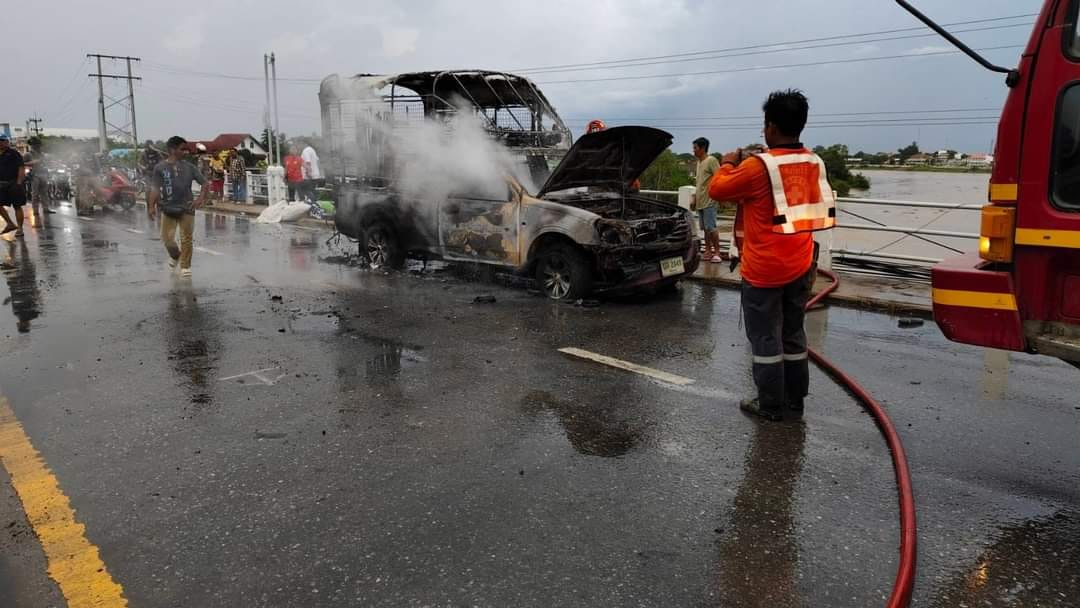 ไฟไหม้รถกระบะพร้อมสินค้าเสียหายวอด กลางสะพานบางระจัน คนขับหนีรอดหวุดหวิด จ.สิงห์บุรี