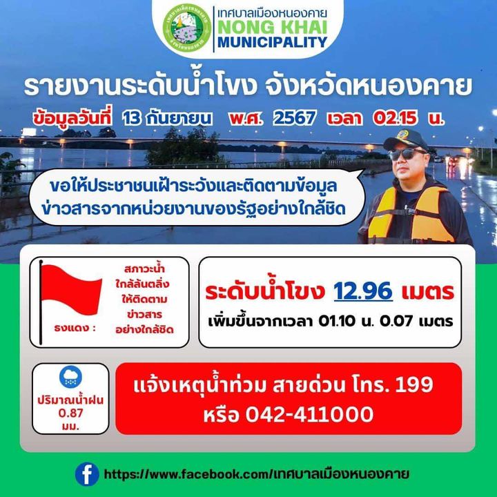 รายงานระดับน้ำโขง จังหวัดหนองคาย ประจำวันที่ 13 กันยายน 2567 เวลา 02.15 น.