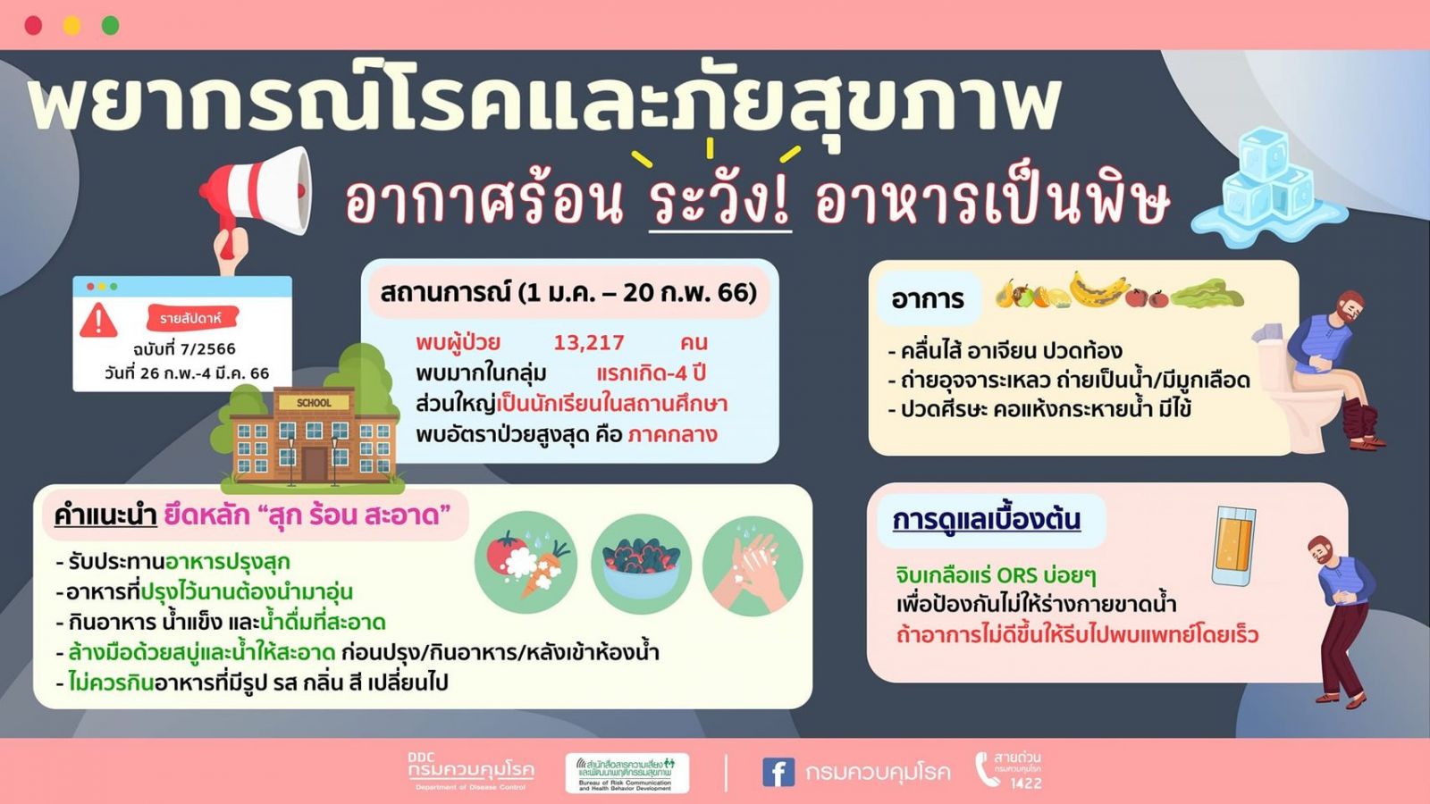"คาดว่ามีโอกาสพบผู้ป่วยโรคอาหารเป็นพิษเพิ่มขึ้น เนื่องจากสภาพอากาศที่ร้อนขึ้น อาจทำให้เชื้อแบคทีเรียก่อโรคเจริญเติบโตได้ดี เมื่อรับประทานอาหารที่มีเชื้อดังกล่าวเข้าไป อาจป่วยด้วยโรคอาหารเป็นพิษได้"