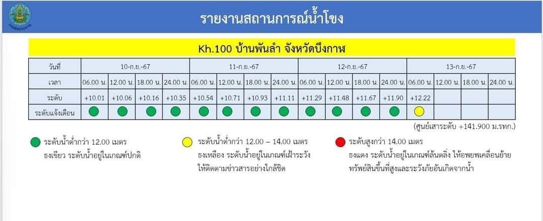 วันที่ 13 กันยายน 2567 จังหวัดบึงกาฬได้ประกาศเตือนภัยน้ำท่วม โดยได้มีการเปลี่ยนธงเตือนภัยเป็นสีเหลือง ซึ่งเป็นสัญญาณบ่งบอกว่าสถานการณ์น้ำท่วมอยู่ในระดับเสี่ยงอันตรายและมีแนวโน้มรุนแรงมากขึ้น ประชาชนในพื้นที่เสี่ยงภัยจึงควรเตรียมพร้อมรับมือกับสถานการณ์ที่อาจเกิดขึ้นได้ทุกเมื่อ