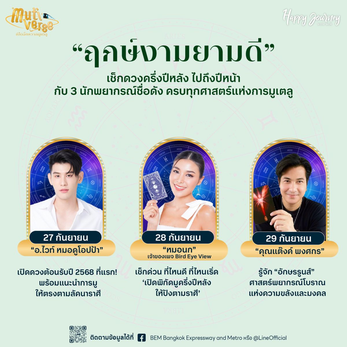 สายมูตัวจริงห้ามพลาด!! ‘Mutiverse เปิดจักรวาลมูเตลู’ วันที่ 27-29 กันยายน 2567 เวลา 10.00-20.00 น. ณ Metro Art MRT สถานีพหลโยธิน โดยงานนี้ยังได้รับการสนับสนุนจาก การรถไฟฟ้าขนส่งมวลชนแห่งประเทศไทย (รฟม.) การทางพิเศษแห่งประเทศไทย (กทพ.), การท่องเที่ยวแห่งประเทศไทย (ททท.) บริษัท ช.การช่าง จำกัด (มหาชน) และบริษัท แบงคอก เมโทร เน็ทเวิร์คส์ จำกัด (BMN) ติดตามรายละเอียดกิจกรรมในแต่ละวันได้ทาง Facebook (เฟซบุ๊ก) และ X (เอ็กซ์): BEM Bangkok Expressway and Metro