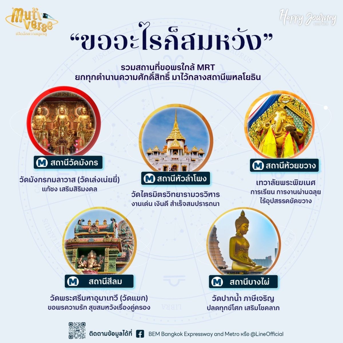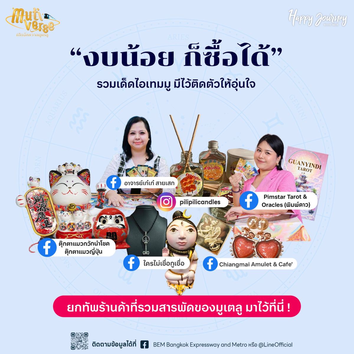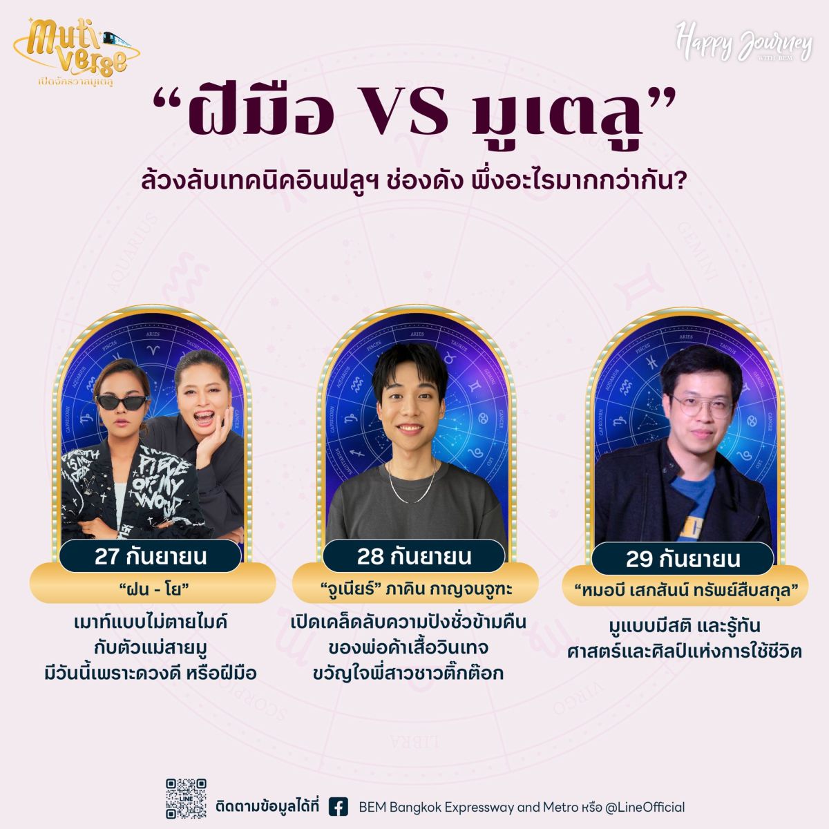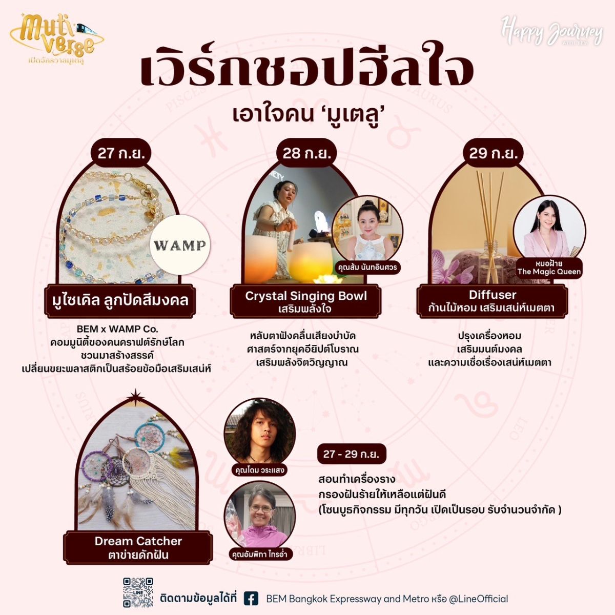 บริษัท ทางด่วนและรถไฟฟ้ากรุงเทพ จำกัด (มหาชน) หรือ BEM เนรมิต Metro Art MRT สถานีพหลโยธิน จัดงาน “Mutiverse” เปิดจักรวาลมูเตลู’ ตั้งแต่วันที่ 27-29 กันยายน 2567 เวลา 10.00-20.00 น. ชวนสายมูร่วมกิจกรรมเชิงสร้างสรรค์ มูกันแบบมีสติ เปิด Map พิกัดสถานที่ขอพรรายรอบเส้นทางรถไฟฟ้า เช็คดวงครึ่งปีหลังกับหมอดูรุ่นใหม่ ฮีลใจทุกศาสตร์ นั่งคุยกับอินฟลูเอนเซอร์ตัวตึงพึ่งอะไรกันแน่ระหว่างฝีมือและดวง เวิร์กช้อปทันสมัยเสริมพลังใจคนรุ่นใหม่และเลือกช้อปมูเตลูไอเทมในงบที่คุณพอใจ พร้อมแจกฟรีโค้ดลับจัดวอลเปเปอร์เสริมดวงตามวันเกิด
