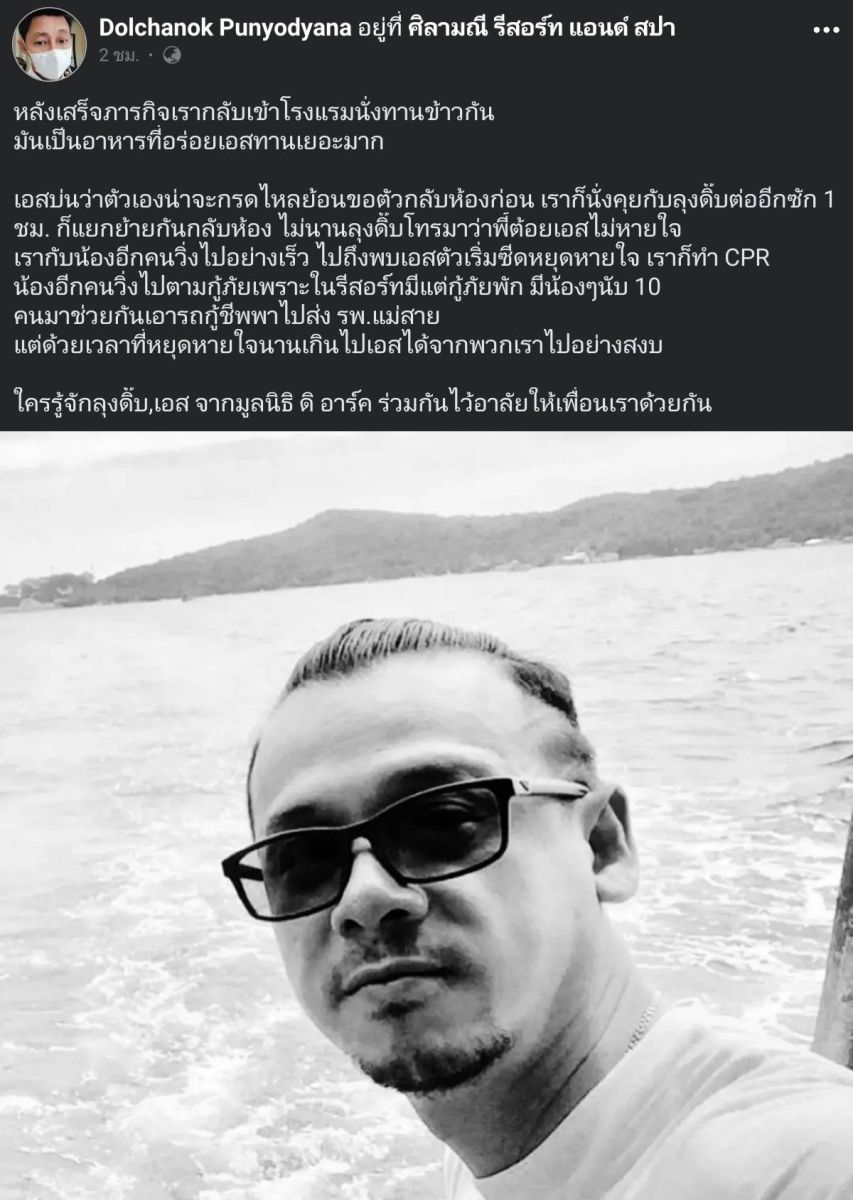 ผู้ใช้เฟซบุ๊ก Dolchanok Punyodyana ได้มีการโพสต์เรื่องราวสุดเศร้า โดยระบุว่า หลังเสร็จภารกิจเรากลับเข้าโรงแรมนั่งทานข้าวกัน มันเป็นอาหารที่อร่อยเอสทานเยอะมาก เอสบ่นว่าตัวเองน่าจะกรดไหลย้อนขอตัวกลับห้องก่อน เราก็นั่งคุยกับลุงดิ๊บต่ออีกซัก 1 ชม. ก็แยกย้ายกันกลับห้อง ไม่นานลุงดิ๊บโทรมาว่าพี้ต้อยเอสไม่หายใจ เรากับน้องอีกคนวิ่งไปอย่างเร็ว ไปถึงพบเอสตัวเริ่มซีดหยุดหายใจ เราก็ทำ CPR น้องอีกคนวิ่งไปตามกู้ภัยเพราะในรีสอร์ทมีแต่กู้ภัยพัก มีน้องๆนับ 10 คนมาช่วยกันเอารถกู้ชีพพาไปส่ง รพ.แม่สาย แต่ด้วยเวลาที่หยุดหายใจนานเกินไปเอสได้จากพวกเราไปอย่างสงบ