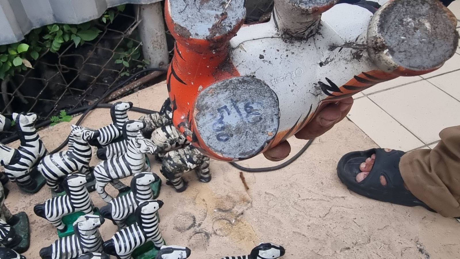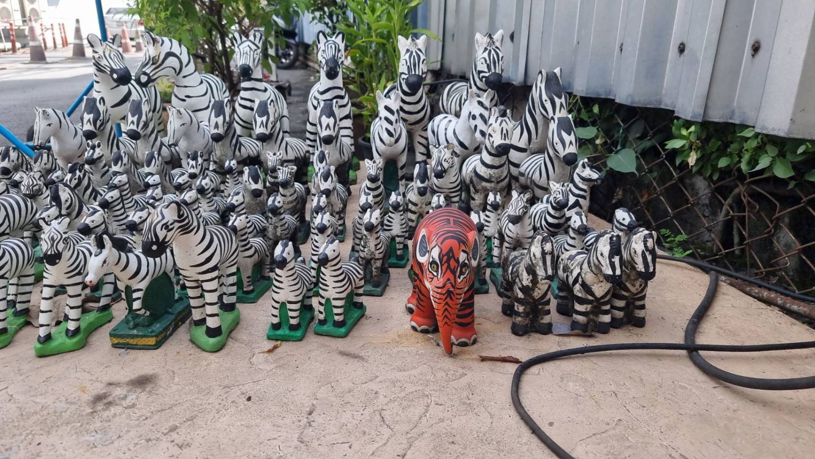 วันที่ 14 ก.ย.67 ที่ศาลพระภูมิเจ้าหน้าที่หน้าศูนย์การค้าแห่งหนึ่ง ในอำเภอปากเกร็ด จังหวัดนนทบุรี ซึ่งมีตุ๊กตาแก้บนส่วนใหญ่เป็นตุ๊กตาม้าลาย แต่ปรากฎว่ามีตุ๊กตาแก้บนตัวหนึ่งที่แปลกประหลาด ไม่เข้าพวกวางปะปนอยู่กับฝูงตุ๊กตาม้าลาย ซึ่งเมื่อมองพิจารณาจึงพบว่าเป็นตุ๊กตารูปช้าง แต่ถูกลงสีเขียนลายเหมือนกับลายเสือพาดกลอน สร้างความฉงนสงสัยให้กับผู้พบเห็นเป็นอย่างมาก สรุปว่าตุ๊กตาตัวดังกล่าวจะเป็นตัวอะไรกันแน่ระหว่าง ช้างกับเสือหรือม้าลาย หรือเป็นตุ๊กตาสัตว์รูปผสมสายพันธุ์ไฮบริดสายพันธุ์ใหม่ แล้วคนที่นำมาถวายแก้บนกับศาลเจ้าหน้าที่ได้บนบานแก้บนด้วยตุ๊กตาสัตว์ชนิดใดกันแน่ ถึงได้ตัดสินใจถวายตุ๊กตาสัตว์แปลกประหลาดแบบนี้
