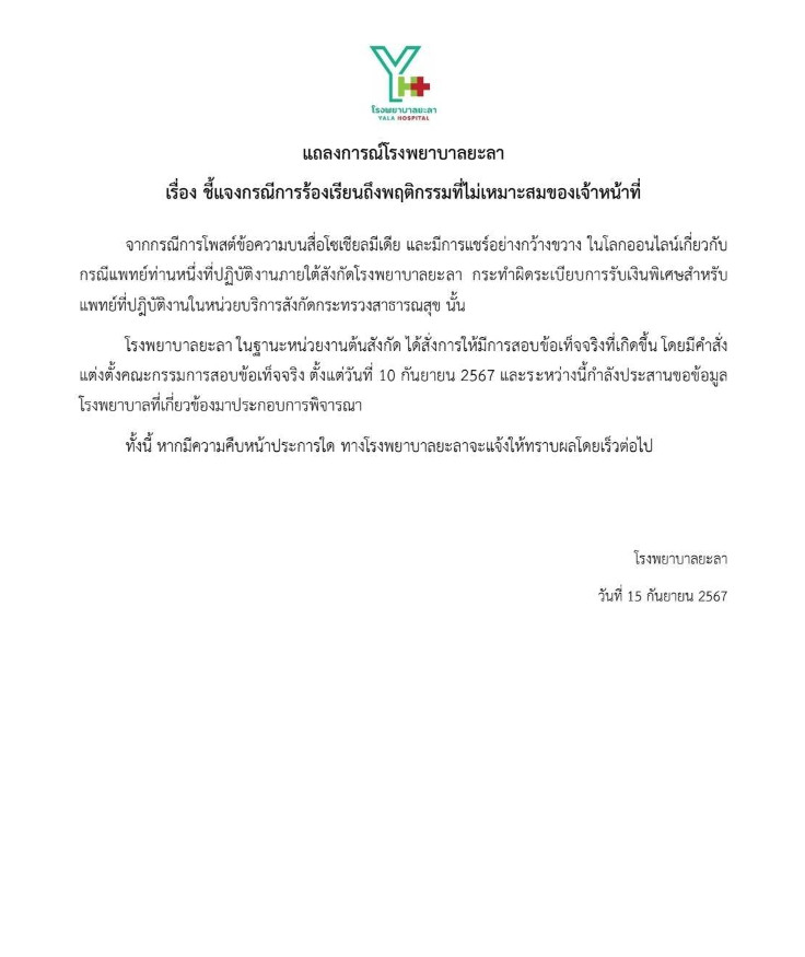 นพ.สวัสดิ์กล่าวต่อว่า กรณีที่ปรากฏเป็นข่าว ได้รับรายงานจากผู้อำนวยการโรงพยาบาลยะลา ว่าหลังได้รับเรื่องจากสำนักงานสาธารณสุขจังหวัดยะลา มีการแต่งตั้งคณะกรรมการสอบข้อเท็จจริงแล้วเมื่อวันที่ 10 กันยายนที่ผ่านมา โดยจะนัดผู้เกี่ยวข้องเข้ามาสอบข้อเท็จจริงในวันที่ 17 กันยายนนี้ ขณะนี้อยู่ระหว่างสอบหาข้อมูลเพิ่มเติม หากมีความคืบหน้าผลการสอบข้อเท็จจริงจะแจ้งให้ทราบต่อไป ซึ่งหากสอบสวนแล้วพบว่า เป็นการไม่ปฏิบัติตามสัญญาจะถูกเรียกเงินเพิ่มพิเศษคืนและถูกปรับเงินอีก 2 เท่าของเงินเพิ่มพิเศษที่เรียกคืน พร้อมดอกเบี้ยในอัตราร้อยละ15 ต่อปี นับแต่เดือนที่ผิดสัญญา