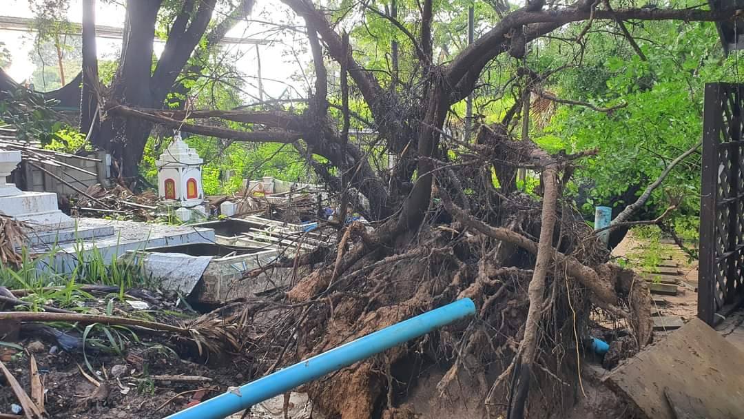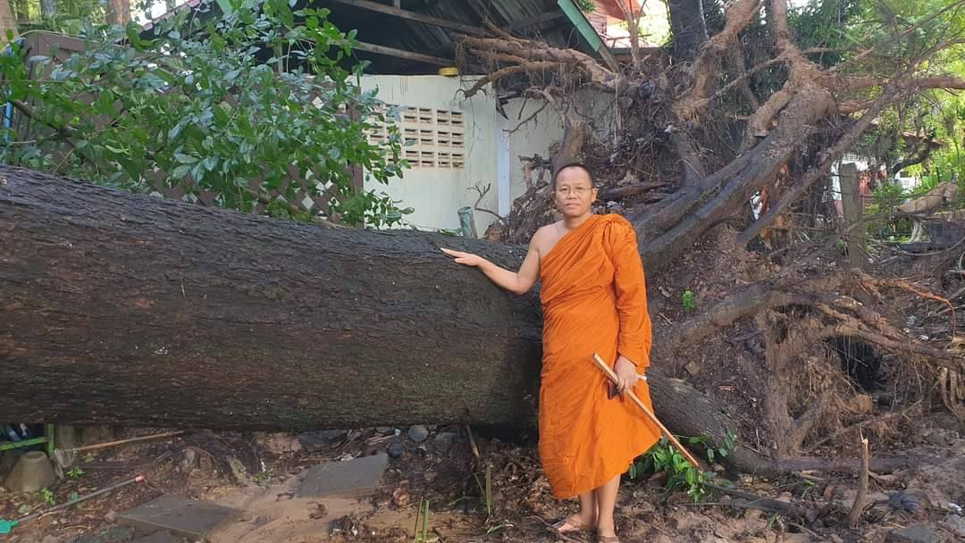 คาดว่ามะขามยักษ์ต้นนี้ เจ้าอาวาสรูปแรกปลูกไว้ แต่คืนที่ผ่านมา เวลาประมาณ02.00น. ทนแรงพายุไม่ไหว ลัมลงมา เฉียดหลังคากุฏิไปนิดเดียว