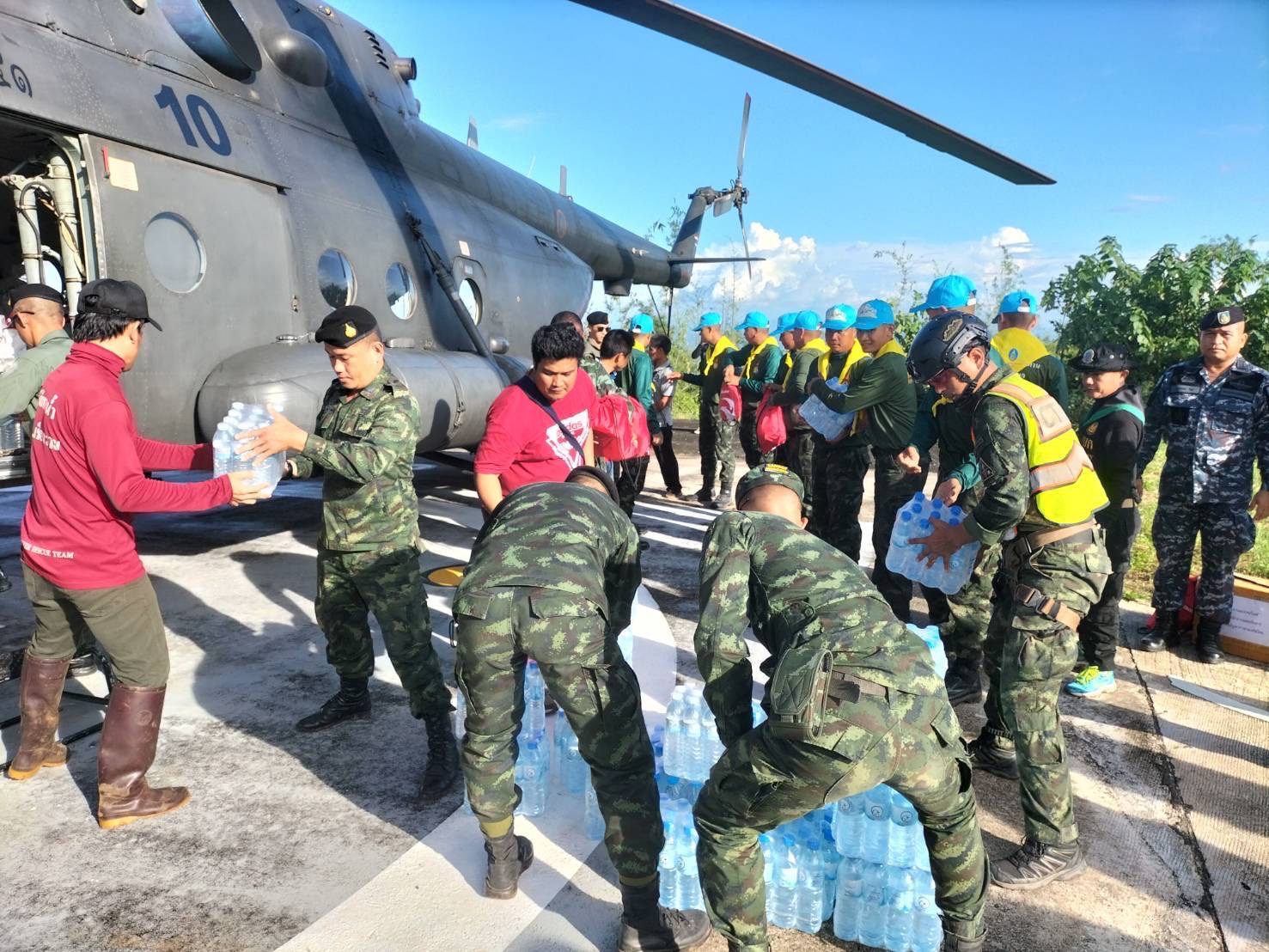 ทั้งนี้ได้มีการ ลำเลียงน้ำดื่มและสิ่งของจำเป็นขึ้นเครื่อง MI-17 จากพื้นราบขึ้นสู่บนที่สูง เพื่อไปแจกจ่ายให้กับประชาชน ที่ได้รับความเดือดร้อน โดยมีบางจุดที่ยังไม่สามารถเข้าไปถึงได้ เนื่องจากเกิดเป็นโคนถล่มและถนนถูกตัดขาด จึงใช้ “ล่อ” ขนสิ่งของจำเป็นเข้าไปแจกจ่ายให้ถึงประชาชนในพื้นที่ประสบภัย และจะขนน้ำดื่ม และข้าวสารอาหารแห้งเข้าไปให้ยังจุดที่ประชาชน ไม่สามารถเดินทางออกได้ ทุกวันจนกว่า จะดำเนินการเรื่อง การเคลียพื้นที่ ดินโคนถล่มเส้นทาง คมนาคมดินโคลนถล่ม ให้ใช้งานได้ตามปกติ