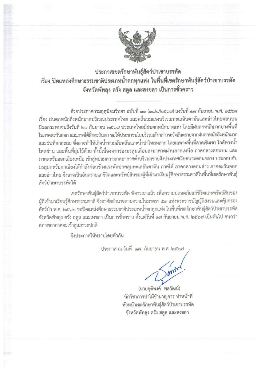 วันที่ 17 กันยายน 2567 ประกาศเขตรักษาพันธุ์สัตว์ป่าเขาบรรทัด เรื่อง ปิดแหล่งศึกษาธรรมชาติ ประเภทน้ำตกทุกแห่ง ในพื้นที่เขตรักษาพันธุ์สัตว์ป่าเขาบรรทัด จังหวัดพัทลุง ตรัง สตูล และสงขลา เป็นการชั่วคราว