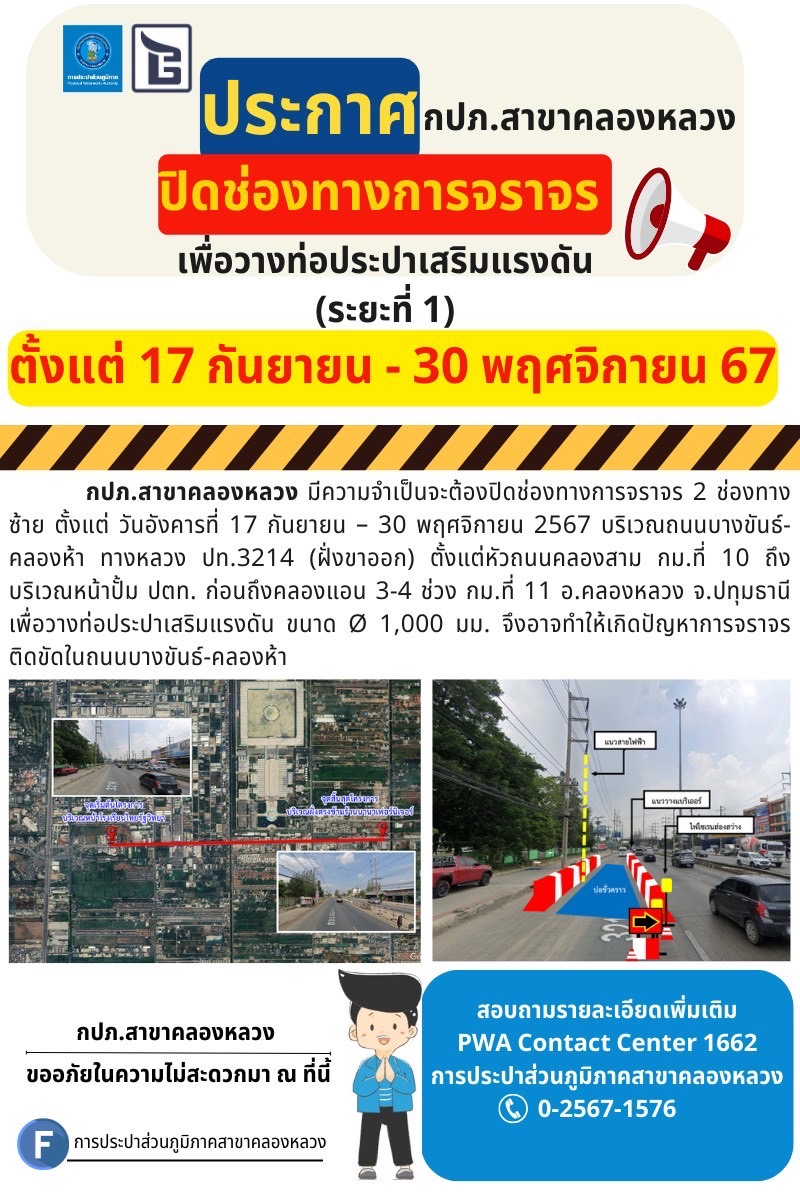 สภ.คลองหลวงประชาสัมพันธ์ กปภ.สาขาคลองหลวง ปิดช่องจราจรเพื่อวางท่อประปาเสริมแรงดัน (ระยะที่1) วันที่ 17 ก.ย.- 30 พ.ย.67