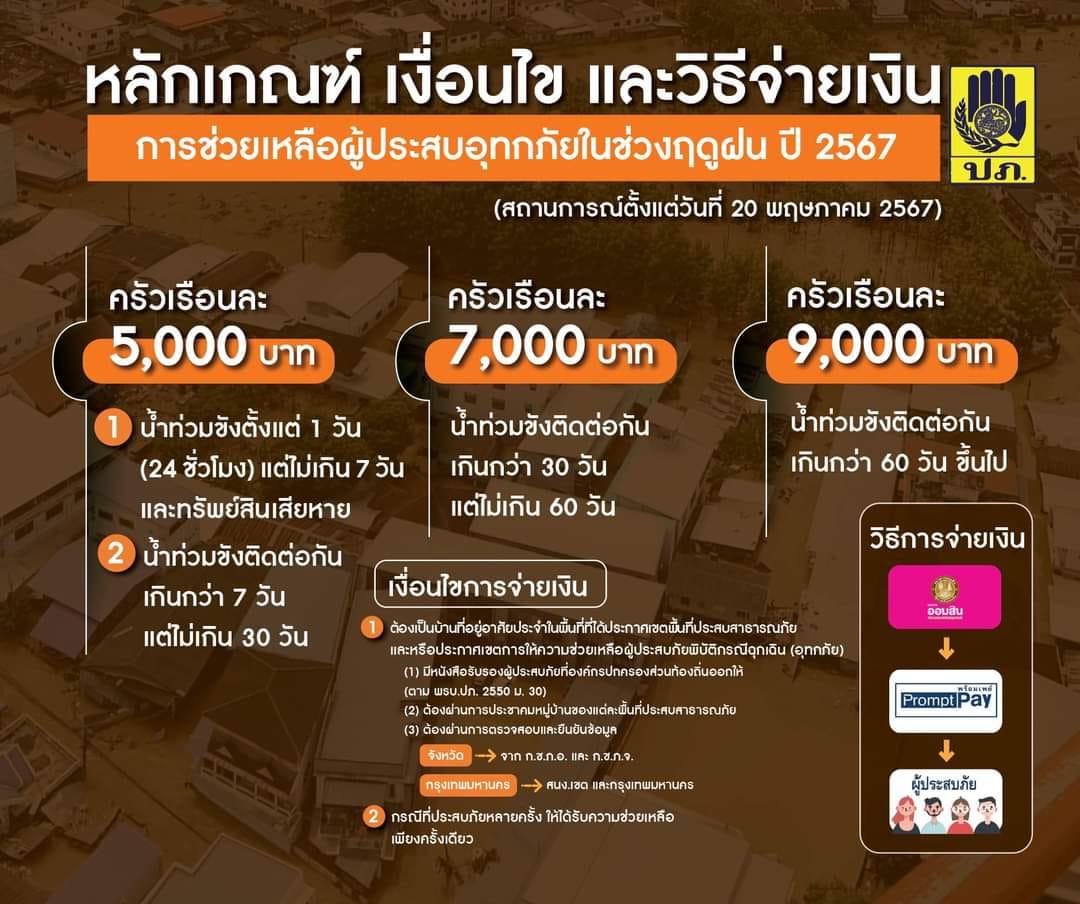 “กระทรวงมหาดไทย โดยกรมป้องกันและบรรเทาสาธารณภัย จะเป็นหน่วยรับงบประมาณและดำเนินการจ่ายเงินช่วยเหลือแก่ผู้ประสบภัย ซึ่งธนาคารออมสินจะจ่ายเงินให้แก่ผู้ประสบภัยที่มีสิทธิได้รับเงินช่วยเหลือโดยตรง โดยการโอนเงินเข้าบัญชีผ่านระบบพร้อมเพย์ (PromptPay) ขณะนี้ ปภ. ได้จัดทำแนวทางปฏิบัติและเตรียมหารือร่วมกับจังหวัดที่ประสบอุทกภัยเพื่อกำหนดแนวทางการจ่ายเงินช่วยเหลือผู้ประสบภัยตามหลักเกณฑ์และเงื่อนไขที่กำหนดให้มีความชัดเจน และสามารถจ่ายเงินช่วยเหลือประชาชนได้ตามกรอบระยะเวลา 90 วัน นับแต่วันที่ได้รับการจัดสรรงบประมาณ และจะได้เร่งทำข้อมูลชี้แจงสร้างความเข้าใจหลักเกณฑ์ต่างๆ ที่เกี่ยวข้องให้พี่น้องประชาชนผู้ประสบภัยได้รับทราบโดยเร็ว เพื่อจะได้เตรียมในการยื่นขอรับเงินช่วยเหลือต่อไป” อธิบดี ปภ. กล่าว
