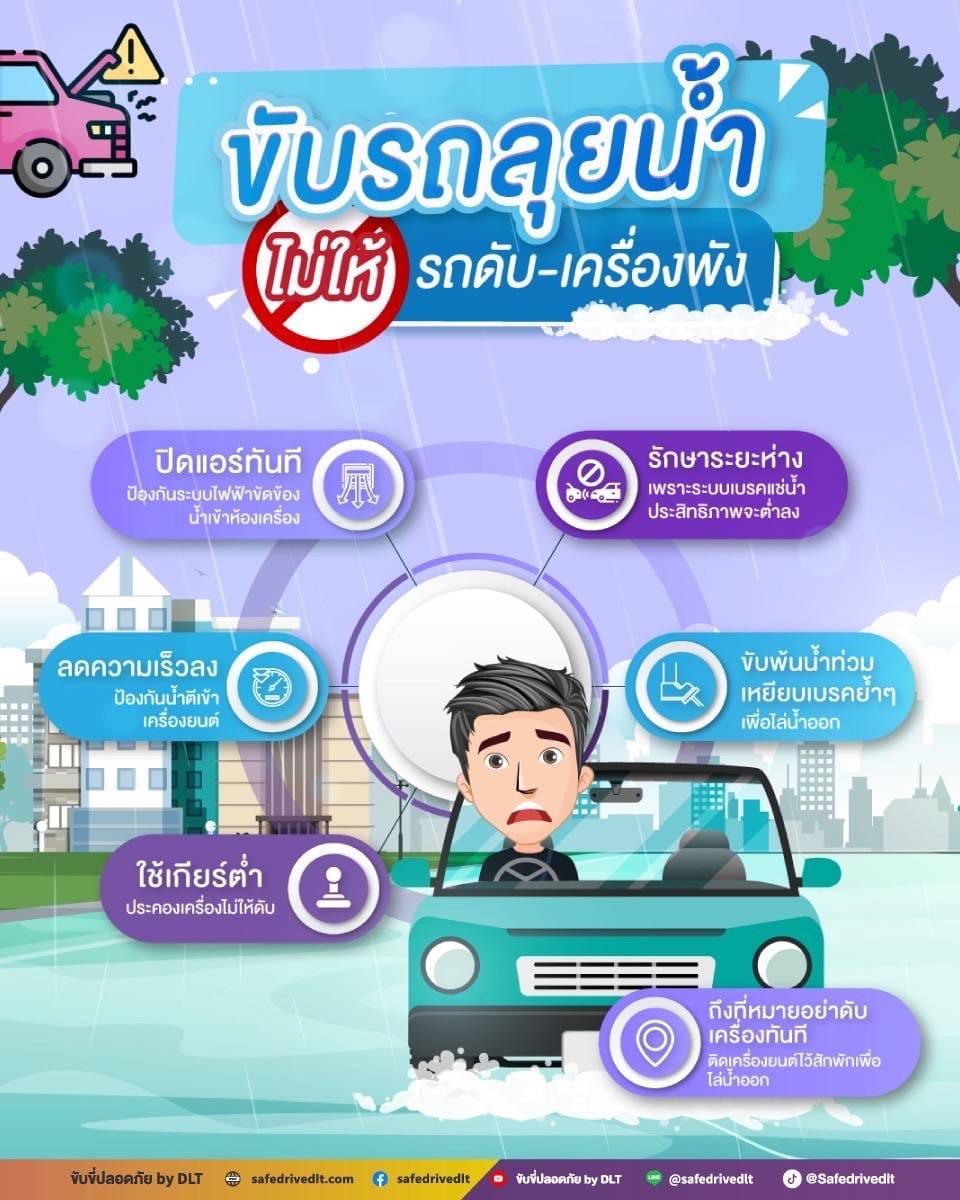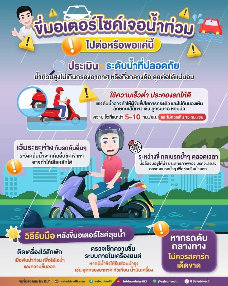 ทั้งนี้ แนะนำให้ตรวจเช็กสภาพรถยนต์ รถจักรยานยนต์ หลังขับผ่านบริเวณน้ำท่วมขัง โดยอาจตรวจประเมินเบื้องต้นด้วยตนเองหรือนำรถเข้าศูนย์บริการ เพื่อความปลอดภัยและมั่นใจในการใช้งาน ก่อนการเดินทางควรตรวจสอบเส้นทางและสภาพอากาศ เพื่อช่วยเพิ่มความปลอดภัยและลดความเสี่ยงต่อการเกิดอุบัติเหตุทางถนนในช่วงฝนตก