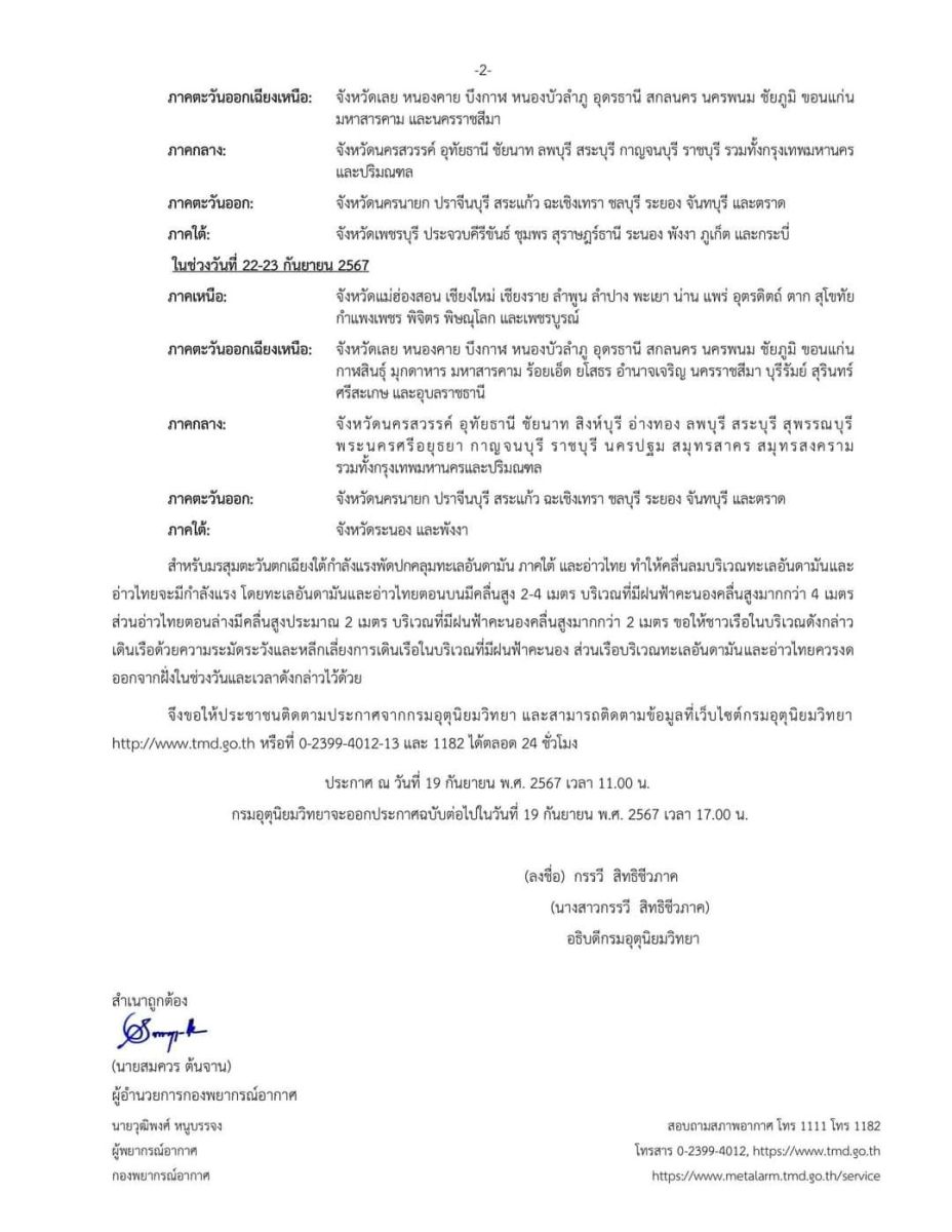 เมื่อเวลา 10.00 น. มีศูนย์กลางอยู่ห่างจากทางด้านตะวันออกเฉียงเหนือของเมืองกวางตรี ประเทศเวียดนามประมาณ 90 กิโลเมตร หรือที่ละติจูด 17.4 องศาเหนือ ลองจิจูด 107.9 องศาตะวันออก มีความเร็วลมสูงสุดใกล้ศูนย์กลางประมาณ 65 กิโลเมตรต่อชั่วโมง พายุนี้กำลังเคลื่อนตัวทางทิศตะวันตก ด้วยความเร็วประมาณ 30 กิโลเมตรต่อชั่วโมง คาดว่าจะเคลื่อนขึ้นฝั่งบริเวณประเทศเวียดนามตอนกลางในคืนนี้ (19 ก.ย. 67) หลังจากนั้นจะอ่อนกำลังลงตามลำดับ ลักษณะเช่นนี้ทำให้มีฝนตกหนักถึงหนักมากกับมีลมแรงในภาคเหนือ ภาคตะวันออกเฉียงเหนือ ภาคกลาง รวมทั้งกรุงเทพมหานครและปริมณฑล ภาคตะวันออก และภาคใต้ ขอให้ประชาชนในบริเวณดังกล่าวระวังอันตรายจากฝนตกหนักถึงหนักมากและฝนที่ตกสะสม ซึ่งอาจทำให้เกิดน้ำท่วมฉับพลัน และน้ำป่าไหลหลาก โดยเฉพาะพื้นที่ลาดเชิงเขา ใกล้ทางน้ำไหลผ่าน และพื้นที่ลุ่มไว้ด้วย