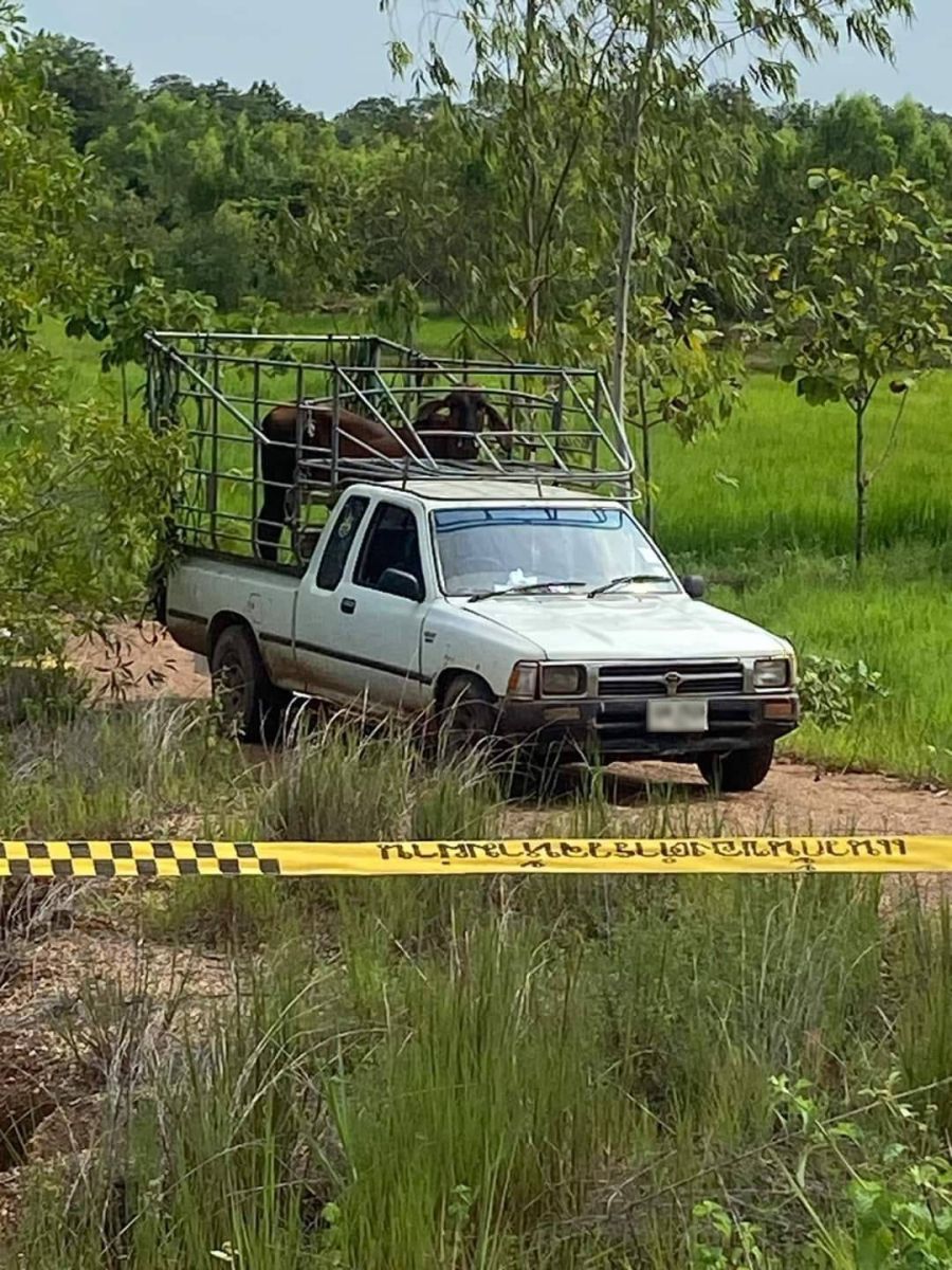 ที่เกิดเหตุ พบผู้เสียชีวิตชาย 2 รายทราบชื่อต่อมา นายเหรียญ อายุ 61 ปี และ นายปิยพงษ์ อายุ 32 ปี ทราบว่าเป็นพ่อ-ลูก ถูกยิงด้วยอาวุธปืนและถูกแทงด้วยอาวุธไม่ทราบชนิดทั้ง 2 ราย นอนเสียชีวิตอยู่บริเวณท้ายรถกระบะขนวัว และได้ตรวจสอบบริเวณโดยรอบ พบเชือกที่คาดว่าจะใช้เป็นอุปกรณ์ในการก่อเหตุ
