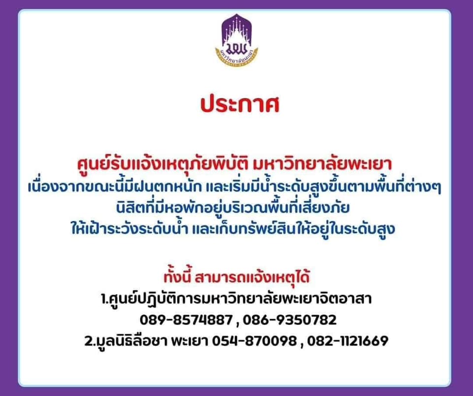 มหาวิทยาลัยพะเยา แจ้งนิสิต - นักศึกษาที่อยู่หอพักให้ย้ายขึ้นที่สูง เนื่องจากฝนตกหนัก และระดับน้ำสูงขึ้น