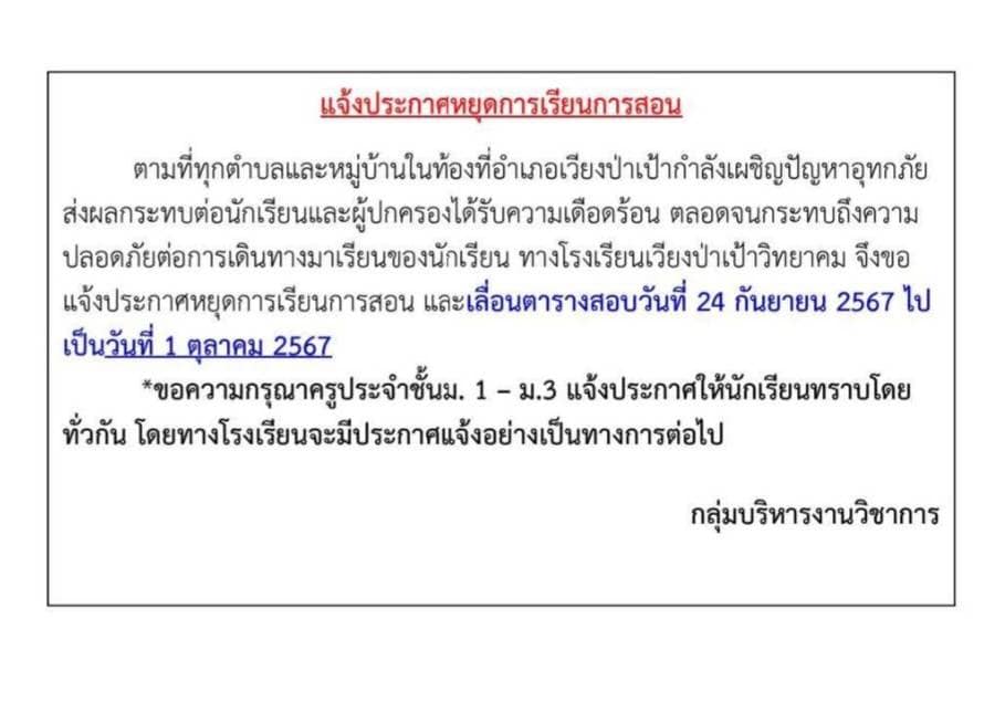 โรงเรียนเวียงป่าเป้าวิทยาคม ประกาศให้นักเรียนมัธยมต้น หยุดการเรียนการสอน ในพรุ่งนี้ 24 ก.ย.67