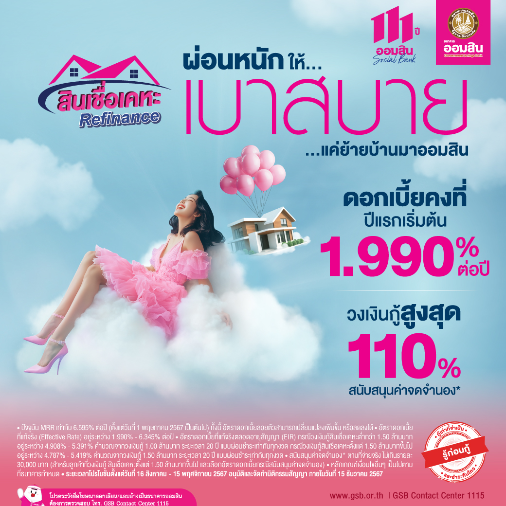 ชีวิตจะเบาสบายขึ้น แค่ย้ายบ้านมาออมสิน …ด้วยสินเชื่อเคหะ Refinance ธนาคารออมสิน ดอกเบี้ยต่ำ ผ่อนสบาย ดอกเบี้ยคงที่ปีแรก เริ่มต้น 1.990% ต่อปี