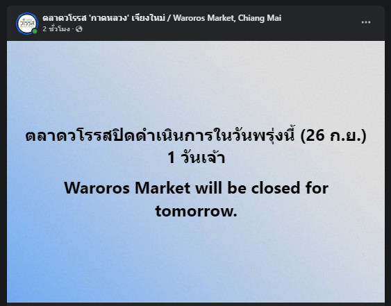 ประกาศ ตลาดวโรรส แจ้งปิดดำเนินการในวันที่ 26 ก.ย.67 เป็นเวลา 1 วัน จ.เชียงใหม่
