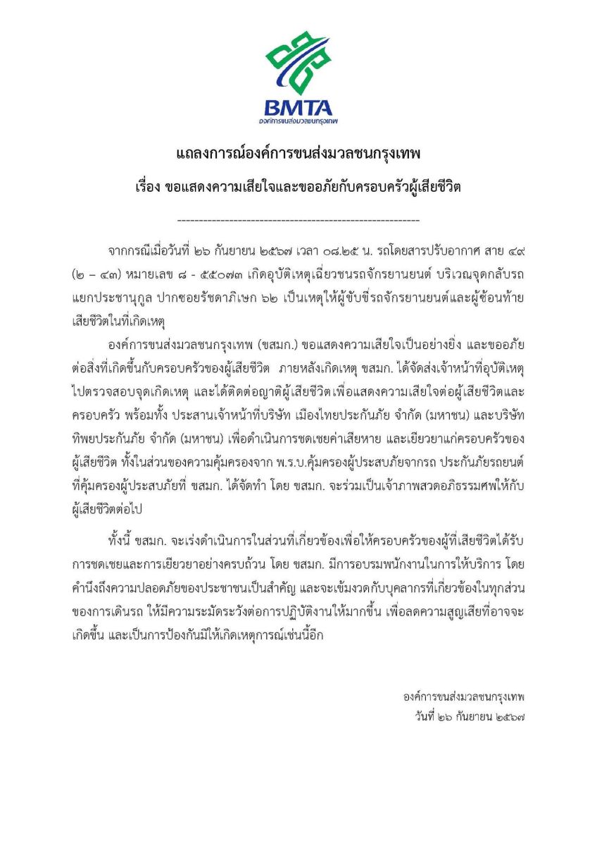 องค์การขนส่งมวลชนกรุงเทพ (ขสมก.) ขอแสดงความเสียใจเป็นอย่างยิ่ง และขออภัยต่อสิ่งที่เกิดขึ้นกับครอบครัวของผู้เสียชีวิต ภายหลังเกิดเหตุ ขสมก. ได้จัดส่งเจ้าหน้าที่อุบัติเหตุเขตการเดินรถที่ 8 ไปตรวจสอบจุดเกิดเหตุ