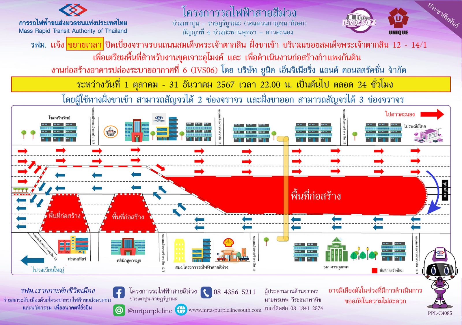การรถไฟฟ้าขนส่งมวลชนแห่งประเทศไทย (รฟม.) แจ้งว่า บริษัท ยูนิค เอ็นจิเนียริ่ง แอนด์ คอนสตรัคชั่น จำกัด (มหาชน) ผู้รับจ้างงานออกแบบและก่อสร้างอุโมงค์ทางวิ่งและสถานีใต้ดิน โครงการรถไฟฟ้าสายสีม่วง ช่วงเตาปูน - ราษฎร์บูรณะ (วงแหวนกาญจนาภิเษก) สัญญาที่ 4 ช่วงสะพานพุทธฯ – ดาวคะนอง มีความจำเป็นต้องปิดเบี่ยงจราจรบนถนนสมเด็จพระเจ้าตากสิน ฝั่งขาเข้า บริเวณซอยสมเด็จพระเจ้าตากสิน 12 – 14/1 เพื่อเตรียมพื้นที่สำหรับงานขุดเจาะอุโมงค์ และ เพื่อดำเนินงานก่อสร้างกำแพงกันดิน งานก่อสร้างอาคารปล่องระบายอากาศที่ 6 (IVS06) ระหว่างวันที่ 1 ตุลาคม – 31 ธันวาคม 2567 เวลา 22.00 น. เป็นต้นไป ตลอด 24 ชั่วโมง โดยผู้ใช้ทางฝั่งขาเข้า สามารถสัญจรได้ 2 ช่องจราจร และฝั่งขาออก สามารถสัญจรได้ 3 ช่องจราจร