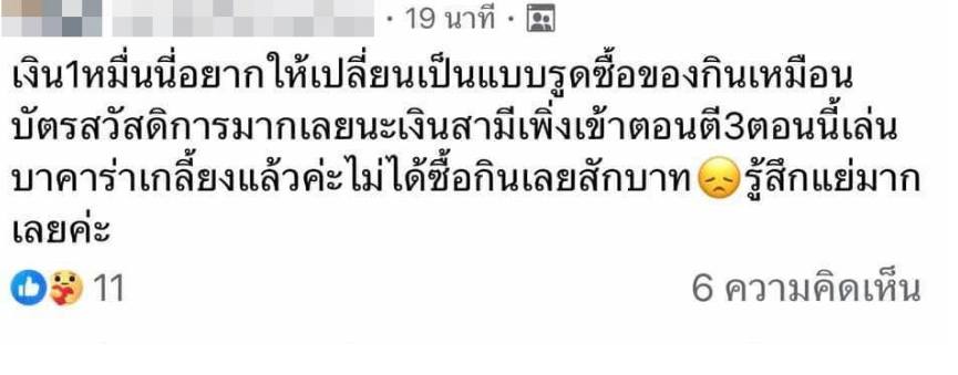 "เงิน 10,000 อยากให้เปลี่ยนเป็นแบบรูดซื้อของกินเหมือนบัตรสวัสดิการแห่งรัฐมากเลยนะ เงินสามีเพิ่งเข้าตอนตี 3 ตอนนี้เล่นพนันออนไลน์เกลี้ยงแล้วค่ะ ไม่ได้ซื้อกินสักบาท รู้สึกแย่มากเลยค่ะ" ซึ่งก็ทำให้มีผู้เข้าไปแสดงความคิดเห็นกันเป็นจำนวนมาก