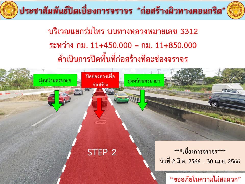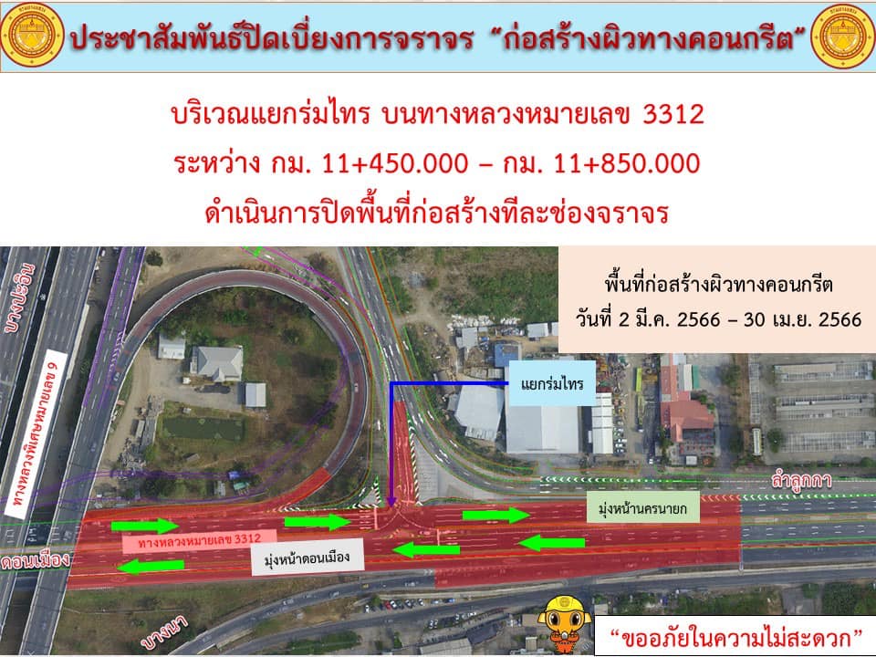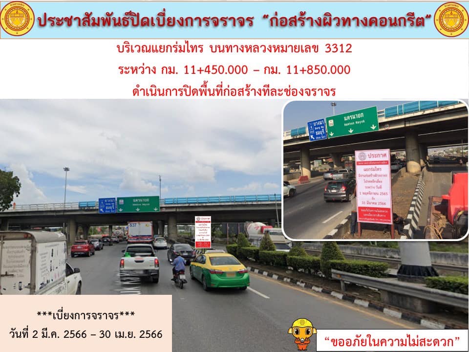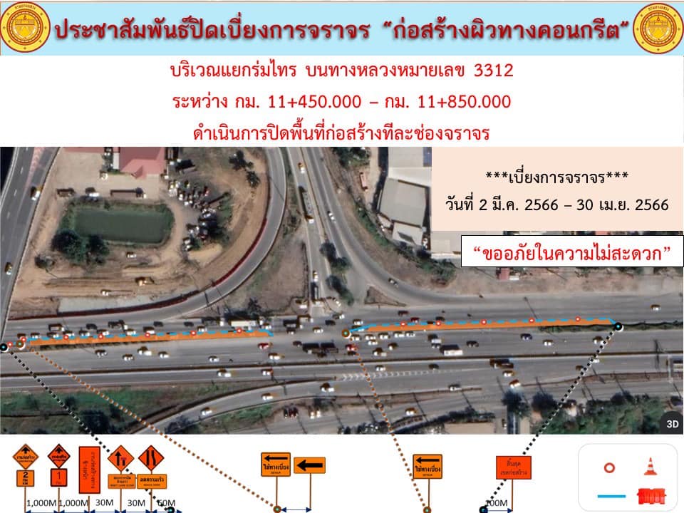 แจ้งประชาสัมพันธ์ ปิดเบี่ยงการจราจร “เพื่อก่อสร้างปรับปรุงผิวทางเป็นผิวทางคอนกรีต บริเวณแยกร่มไทร บนทางหลวงหมายเลข 3312” กม.11+450 - 11+850 ด้านซ้ายและขวาทางระหว่างวันที่ 2 มีนาคม 2566 - วันที่ 30 เมษายน 2566