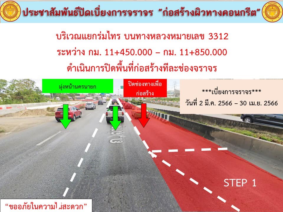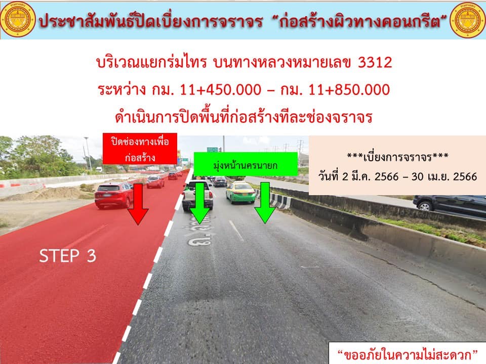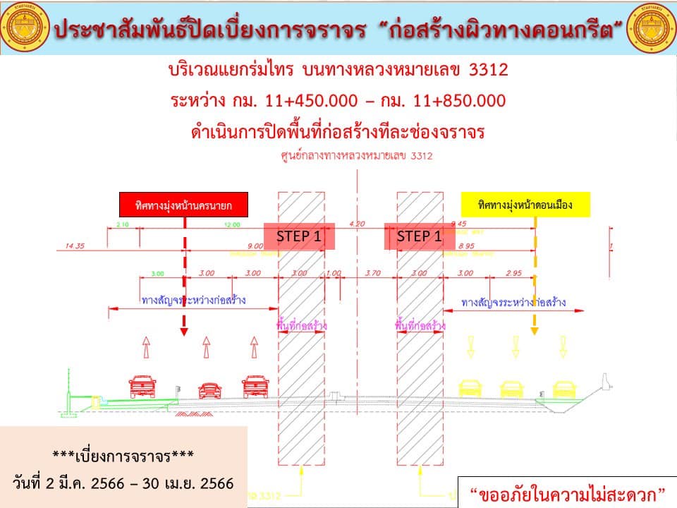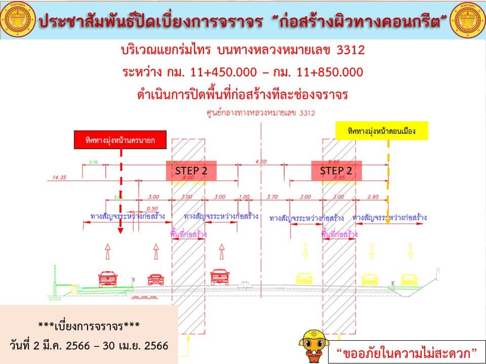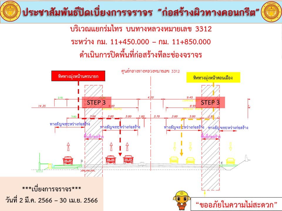 แจ้งประชาสัมพันธ์ ปิดเบี่ยงการจราจร “เพื่อก่อสร้างปรับปรุงผิวทางเป็นผิวทางคอนกรีต บริเวณแยกร่มไทร บนทางหลวงหมายเลข 3312” กม.11+450 - 11+850 ด้านซ้ายและขวาทางระหว่างวันที่ 2 มีนาคม 2566 - วันที่ 30 เมษายน 2566