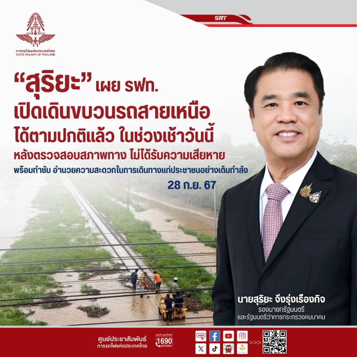 “สุริยะ” เผย การรถไฟฯ กลับมาเปิดเดินรถสายเหนือได้ตามปกติ กำชับอำนวยความสะดวกการเดินทางให้ประชาชนในช่วงฤดูฝนอย่างเต็มที่ “วีริศ” แจงภายในสถานี-ทางรถไฟ ไม่ได้รับความเสียหายจากเหตุน้ำท่วม เปิดให้บริการได้ 100%
