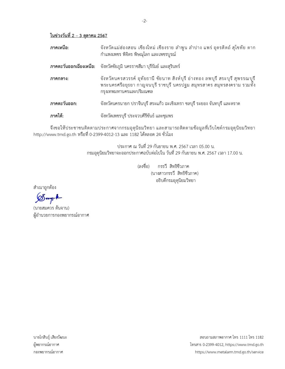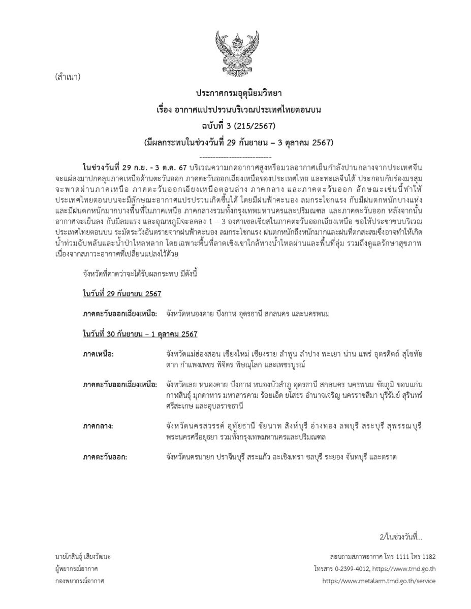 วันนี้ (29 ก.ย.2567) น.ส.กรรวี สิทธิชีวภาค อธิบดีกรมอุตุนิยมวิทยา ออกประกาศกรมอุตุนิยมวิทยาเรื่องอากาศแปรปรวนบริเวณประเทศไทยตอนบนฉบับที่ 3 มีผลกระทบในช่วงวันที่ 29 ก.ย.-3 ต.ค.นี้