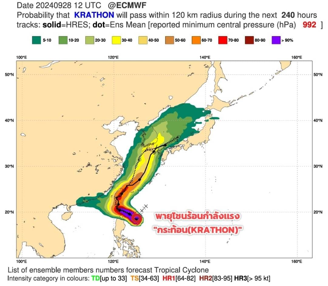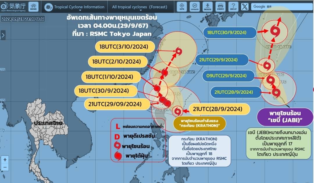 นอกจากนี้ กรมอุตุนิยมวิทยา อัปเดตสถานการณ์พายุหมุนเขตร้อน เมื่อเวลา 04.00 น.บริเวณมหาสมุทรแปซิฟิกตะวันตก มีพายุอยู่ 2 ลูกที่ 1พายุโซนร้อนกำลังแรง "กระท้อน” (KRATHON) หมายถึงชื่อผลไม้ชนิดหนึ่ง ตั้งชื่อโดยประเทศไทย เป็นพายุลูกที่ 18 (RSMC โตเกียว ประเทศญี่ปุ่น) ศูนย์กลางยังอยู่ทางด้านตะวันออกของเกาะลูซอล ประเทศฟิลิปปินส์ มีแนวโน้มจะแรงขึ้นเป็นพายุไต้ฝุ่นได้ เนื่องจากยังอยู่ในทะเลที่อุ่น แต่ทิศทางการเคลื่อนตัวจะไปทางเกาะไต้หวัน และโค้งกลับไปทางประเทศญี่ปุ่น