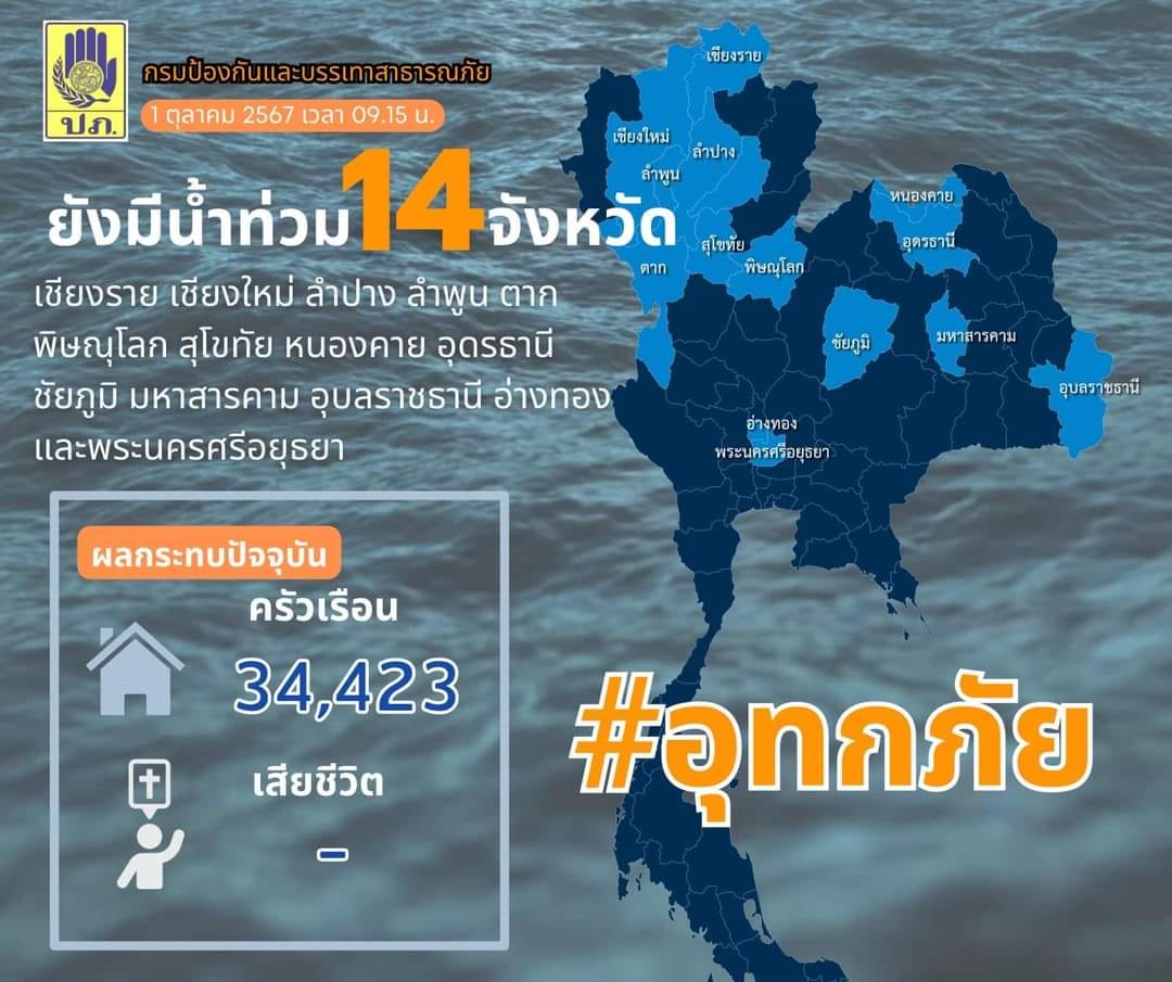 กรมป้องกันและบรรเทาสาธารณภัย (ปภ.) รายงานว่าในระหว่างวันที่ 16 ส.ค. – 1 ต.ค. 67 เกิดสถานการณ์น้ำท่วมในพื้นที่ 37 จังหวัด ได้แก่ เชียงราย เชียงใหม่ แม่ฮ่องสอน ตาก พะเยา น่าน ลำพูน ลำปาง แพร่ อุตรดิตถ์ สุโขทัย พิษณุโลก นครสวรรค์ เพชรบูรณ์ เลย อุดรธานี หนองคาย นครพนม ขอนแก่น ชัยภูมิ มหาสารคาม บึงกาฬ หนองบัวลำภู อุบลราชธานี ปราจีนบุรี อ่างทอง พระนครศรีอยุธยา ปทุมธานี ระยอง ชุมพร สุราษฎร์ธานี ภูเก็ต ยะลา นครศรีธรรมราช พังงา ตรัง และสตูล รวมพื้นที่ได้รับผลกระทบ 220 อำเภอ 942 ตำบล 5,004 หมู่บ้าน ประชาชนได้รับผลกระทบ 181,870 ครัวเรือน มีผู้เสียชีวิตรวม 49 ราย และได้รับบาดเจ็บรวม 28 คน ซึ่งปัจจุบันยังคงมีสถานการณ์อุทกภัยในพื้นที่ 14 จังหวัด ได้แก่ เชียงราย เชียงใหม่ ลำปาง ลำพูน ตาก พิษณุโลก สุโขทัย หนองคาย อุดรธานี ชัยภูมิ มหาสารคาม อุบลราชธานี อ่างทอง และพระนครศรีอยุธยา รวมพื้นที่ได้รับผลกระทบ 48 อำเภอ 232 ตำบล 1,215 หมู่บ้าน ประชาชนได้รับผลกระทบ 34,423 ครัวเรือน รายละเอียด ดังนี้