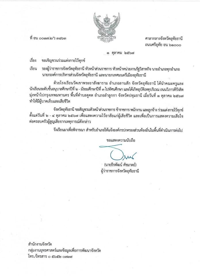 จังหวัดอุทัยธานี ขอเชิญชวนหัวหน้าส่วนราชการ ข้าราชการ พนักงาน และลูกจ้าง ร่วมแต่งกายไว้ทุกข์ตั้งแต่วันที่ 2-4 ตุลาคม 2567 เพื่อแสดงความไว้อาลัยแก่ผู้เสียชีวิต และเพื่อเป็นการแสดงความเสียใจต่อครอบครัวผู้สูญเสียจากเหตุการณ์ดังกล่าว".