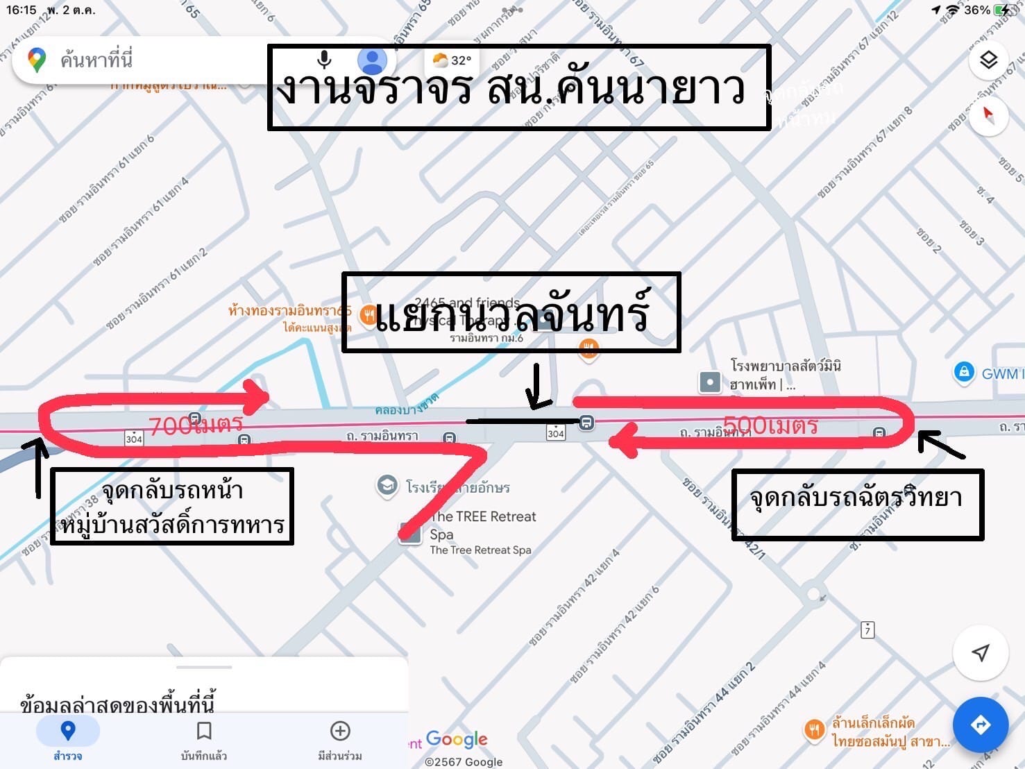 2.) ส่วนรถที่ใช้ถนนรามอินทรา ขาออก ที่ต้องการเข้าซอยนวลจันทร์ ให้ตรงไปกลับรถบริเวณจุดกลับรถฉัตรวิทยา (รามอินทรา 44)