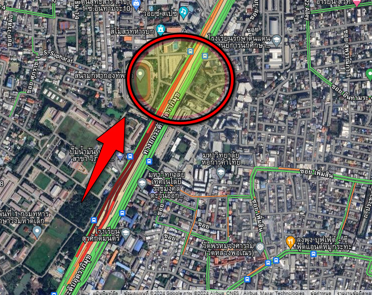 เวลา 22.50 น. วันที่ 2 ตุลาคม 2567 ถนนวิภาวดี - รังสิต ขาออก ช่วงหน้าสนามกีฬากองทัพบก มีเจ้าหน้าที่ทำงานปรับผิวการจราจร ในช่องทางหลัก รถเคลื่อนตัวได้ช้าๆ
