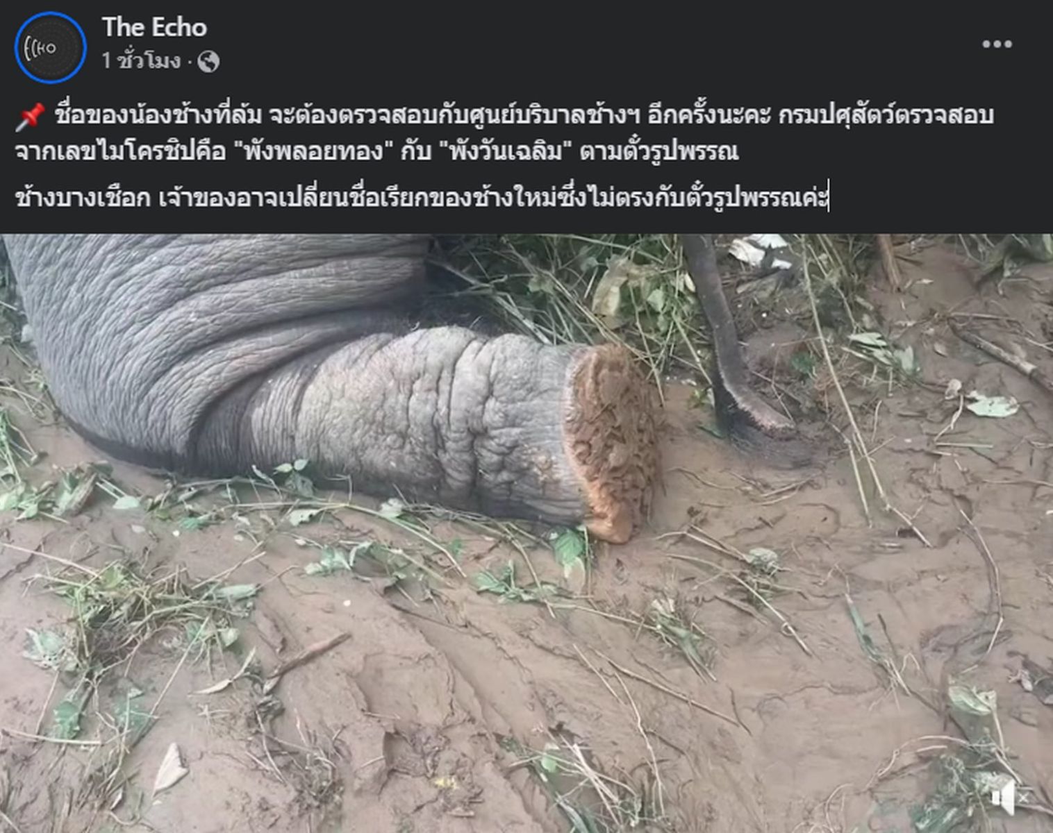 ขณะที่ เพจ The Echo ระบุ เพิ่มเติมในอีกมุมหนึ่ง ว่า "ชื่อของน้องช้างที่ล้ม จะต้องตรวจสอบกับศูนย์บริบาลช้างฯ อีกครั้ง กรมปศุสัตว์ตรวจสอบจากเลขไมโครชิปคือ "พังพลอยทอง" กับ "พังวันเฉลิม" ตามตั๋วรูปพรรณ ช้างบางเชือก เจ้าของอาจเปลี่ยนชื่อเรียกของช้างใหม่ซึ่งไม่ตรงกับตั๋วรูปพรรณค่ะ"