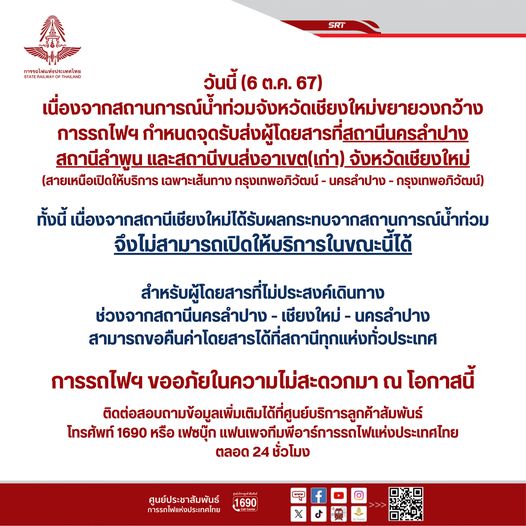 วันนี้ (6 ต.ค. 67) เนื่องจากสถานการณ์น้ำท่วมจ้งหวัดเชียงใหม่ขยายวงกว้าง การรถไฟฯ กำหนดจุดรับส่งผู้โดยสารที่สถานีนครลำปาง สถานีลำพูน และสถานีขนส่งอาเขต(เก่า) จังหวัดเชียงใหม่ (สายเหนือเปิดให้บริการ เฉพาะเส้นทาง กรุงเทพอภิวัฒน์ - นครลำปาง - กรุงเทพอภิวัฒน์)