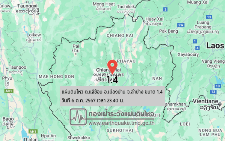 เวลา 23.40 น. วันที่ 6 ตุลาคม 2567 กองเฝ้าระวังแผ่นดินไหว กรมอุตุนิยมวิทยา แจ้งเหตุแผ่นดินไหว ขนาด 1.4 ความลึก 1 กม. ภายในพื้นที่ของ ต.แจ้ซ้อน อ.เมืองปาน จ.ลำปาง (18.80°N,99.50°E) ยังไม่มีรายงานผลกระทบจากแรงสั่นสะเทือน