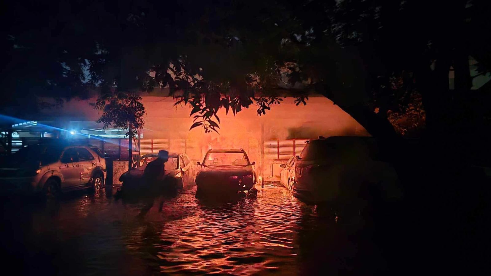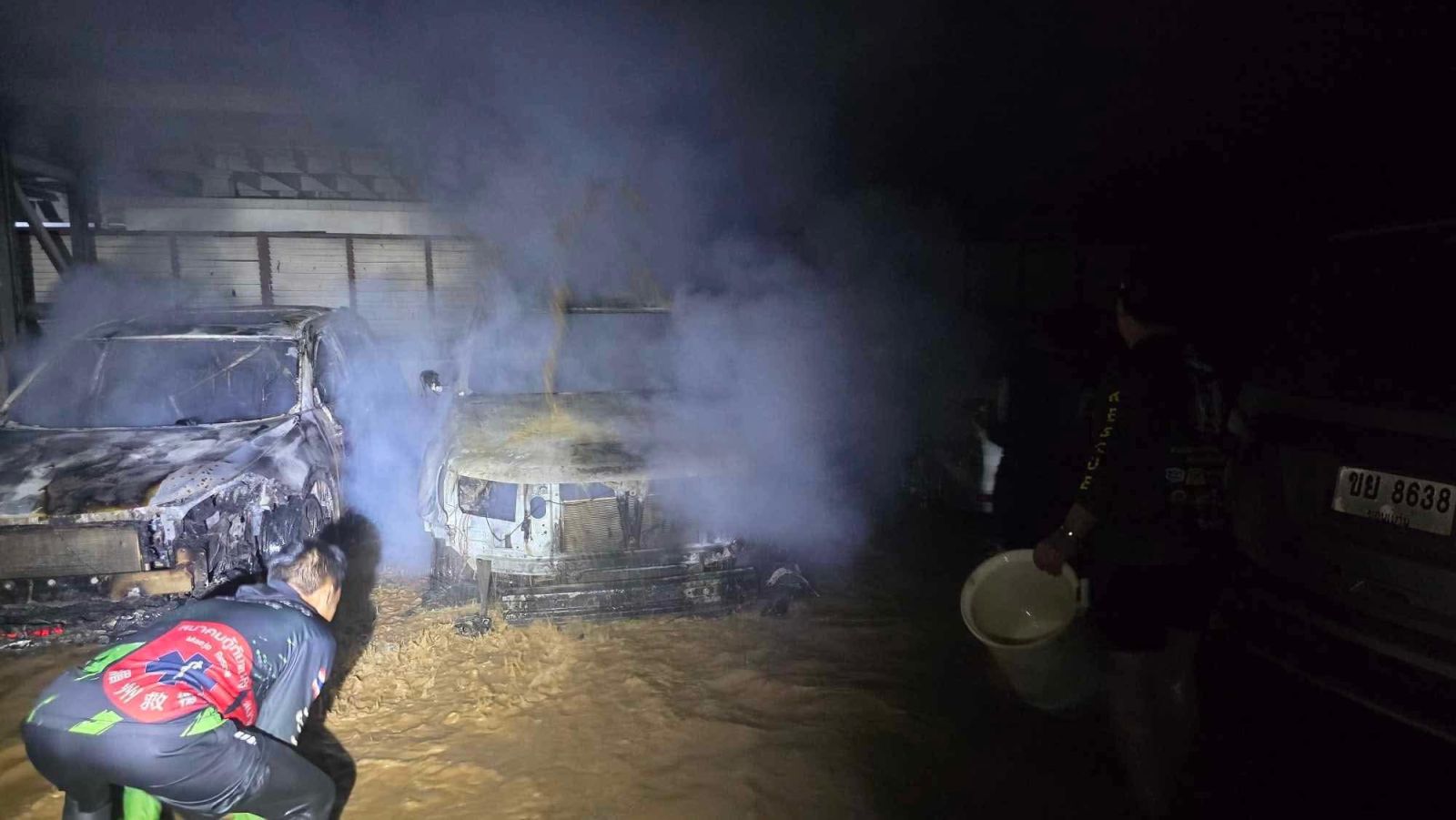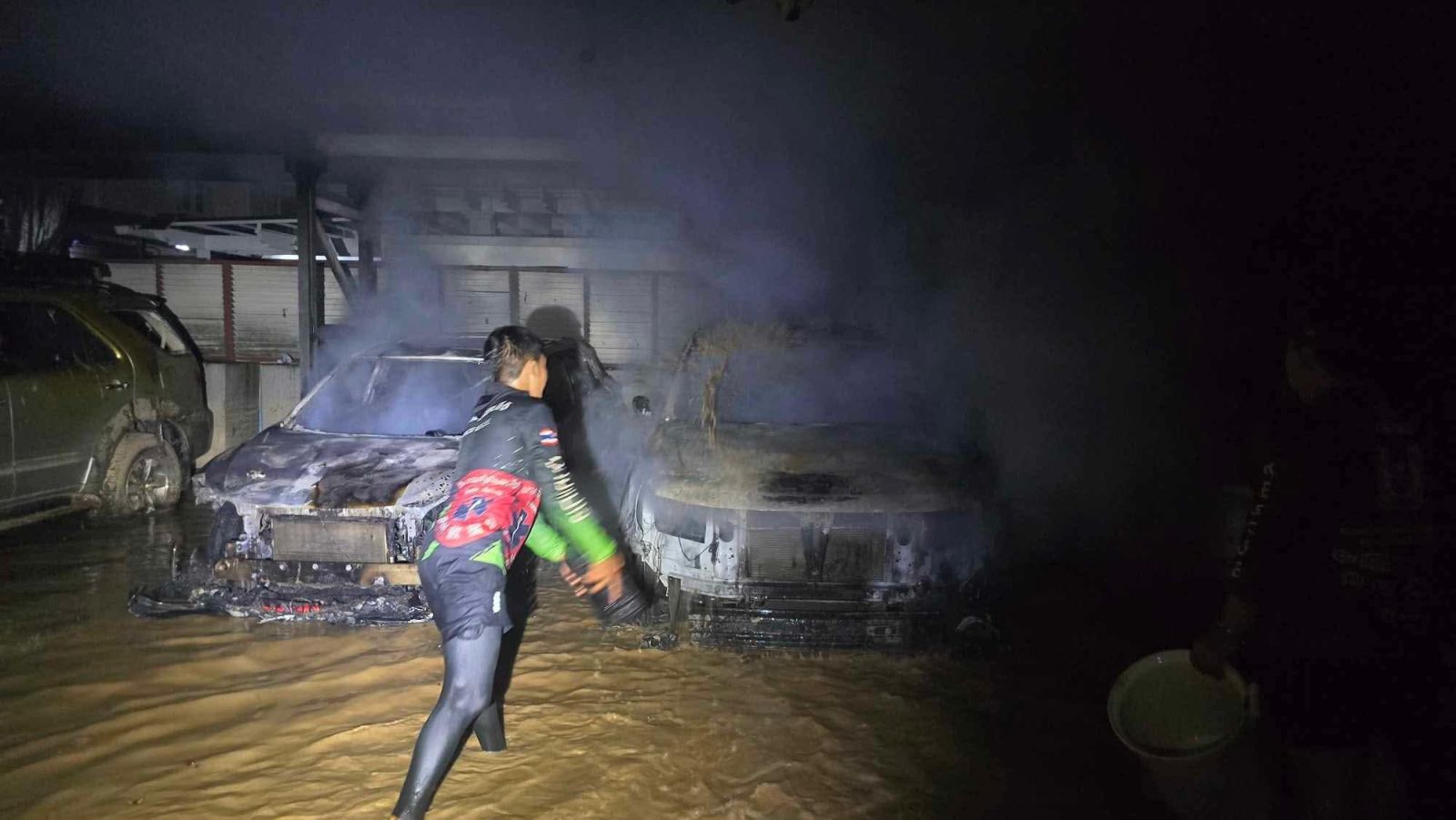 ที่เกิดอยู่ภายในหมู่บ้านที่ถูกน้ำท่วม เจ้าหน้าที่ต้องใช้เรือดับเพลิงเดินทาง และเดินเท้าเข้าไประงับเหตุ พบว่าเพลิงกำลังลุกไหม้รถยนต์ที่จอดอยู่ในโรงจอดรถ ที่มีน้ำท่วมสูงระดับ 30 - 40 ซม. ทางอาสากู้ภัยใช้มือวิดน้ำ, ถังน้ำ เข้าช่วยกันดับไฟ จนเพลิงสงบในเวลาต่อมา ไม่ลุกลามถึงตัวบ้าน เบื้องต้นมีรถยนต์ได้รับความเสียหาย 2 คัน ไม่มีผู้บาดเจ็บหรือเสียชีวิต