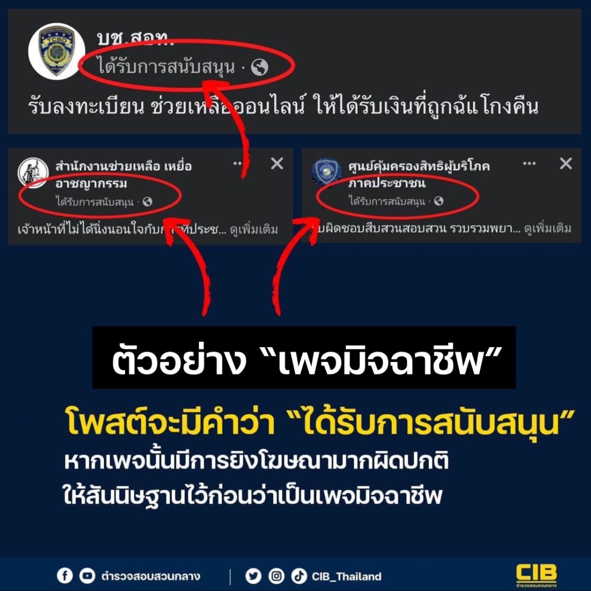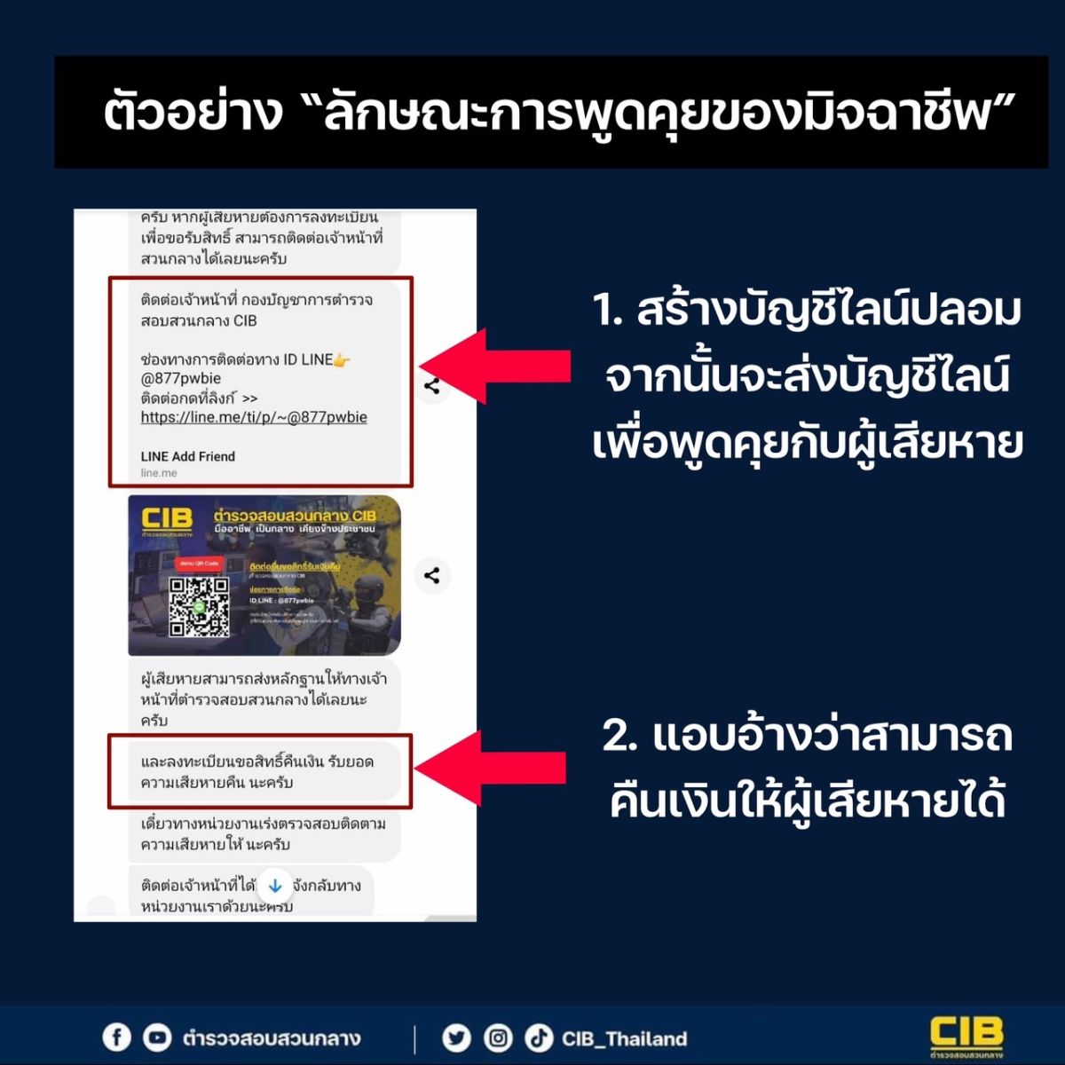 จากกรณีกลุ่มมิจฉาชีพสร้างเพจเฟซบุ๊ก และแอปพลิเคชันไลน์ปลอม ใช้ชื่อเป็นหน่วยงานตำรวจสอบสวนกลาง (CIB) หรือสร้างบัญชีที่มีชื่อคล้ายกับเพจของหน่วยงานผู้บังคับใช้กฎหมาย, ตำรวจ หรือ ศูนย์ช่วยเหลือทางออนไลน์ต่างๆ จากนั้นจะมีการซื้อโฆษณาจากแพลตฟอร์ม เพื่อให้ประชาชนเห็นบัญชีปลอมของมิจฉาชีพอย่างแพร่หลาย ทำทีให้คำปรึกษาเรื่องกฎหมาย หรือคดีความต่างๆ หรืออ้างว่าสามารถรับแจ้งความและติดตามเงินมาให้ผู้เสียหายได้ จากนั้นมิจฉาชีพจะส่งบัญชีไลน์ให้ผู้เสียหายแอบอ้างว่าเป็นเจ้าหน้าที่รัฐ และติดต่อพูดคุยผ่านทางไลน์ให้ผู้เสียหายส่งข้อมูลส่วนตัวโดยอ้างว่าเป็นการรับสิทธิขอเงินคืน ทำให้มีประชาชนหลงเชื่อหลงโอนเงินจ่ายค่าดำเนินการ เกิดความเสียหายจำนวนมาก