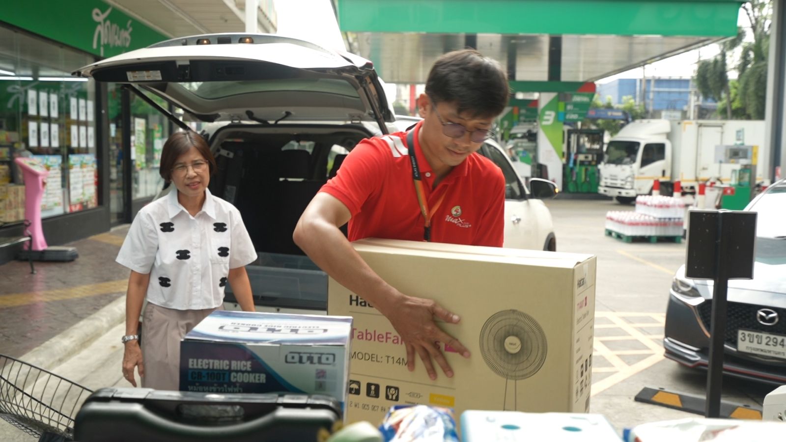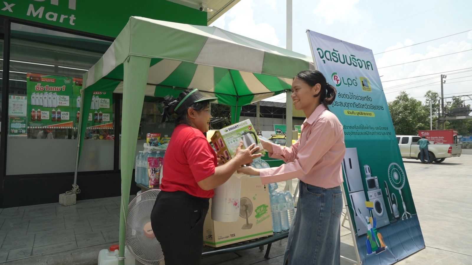 พีทีได้จึงเปิดจุดรับบริจาคภายในปั๊มพีที ในเขตกรุงเทพฯและปริมณฑล โดยเน้นขอรับบริจาคเครื่องใช้ไฟฟ้าใหม่ และมือสอง รวมถึงอุปกรณ์และเคมีภัณฑ์ทำความสะอาด เพื่อรวบรวมให้ทางมูลนิธิกระจกเงา นำไปส่งมอบให้กับผู้ประสบภัยต่อไป ผู้ที่สนใจสามารถนำสิ่งของไปบริจาคได้ที่ปั๊มพีทีทั้ง 5 สาขา ดังนี้