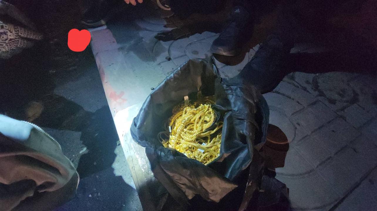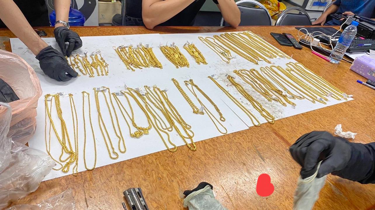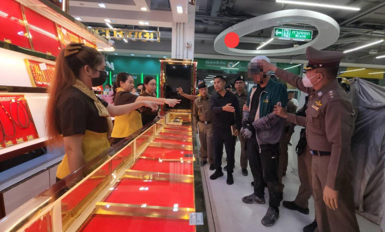 รูปพรรณบนแผงโชว์ที่อยู่ด้านหลังของพนักงานสาว 3 คน ขณะกำลังอยู่หน้าร้าน โดยกวาดสร้อยคอทองคำใส่กระเป๋าสะพายไปได้ 84 เส้น รวมน้ำหนัก 205 บาท จากนั้นคนร้ายได้กระโดดออกทางเดิมวิ่งหลบหนีไป