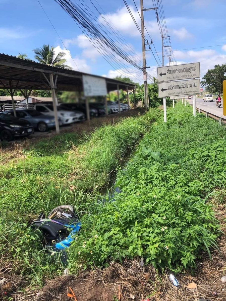 คุณลุงวัย 60 ปีขี่รถจักรยานยนต์เสียหลักตกคูน้ำข้างทาง เสียชีวิต ถนนเลี่ยงเมืองสุราษฎร์ธานี