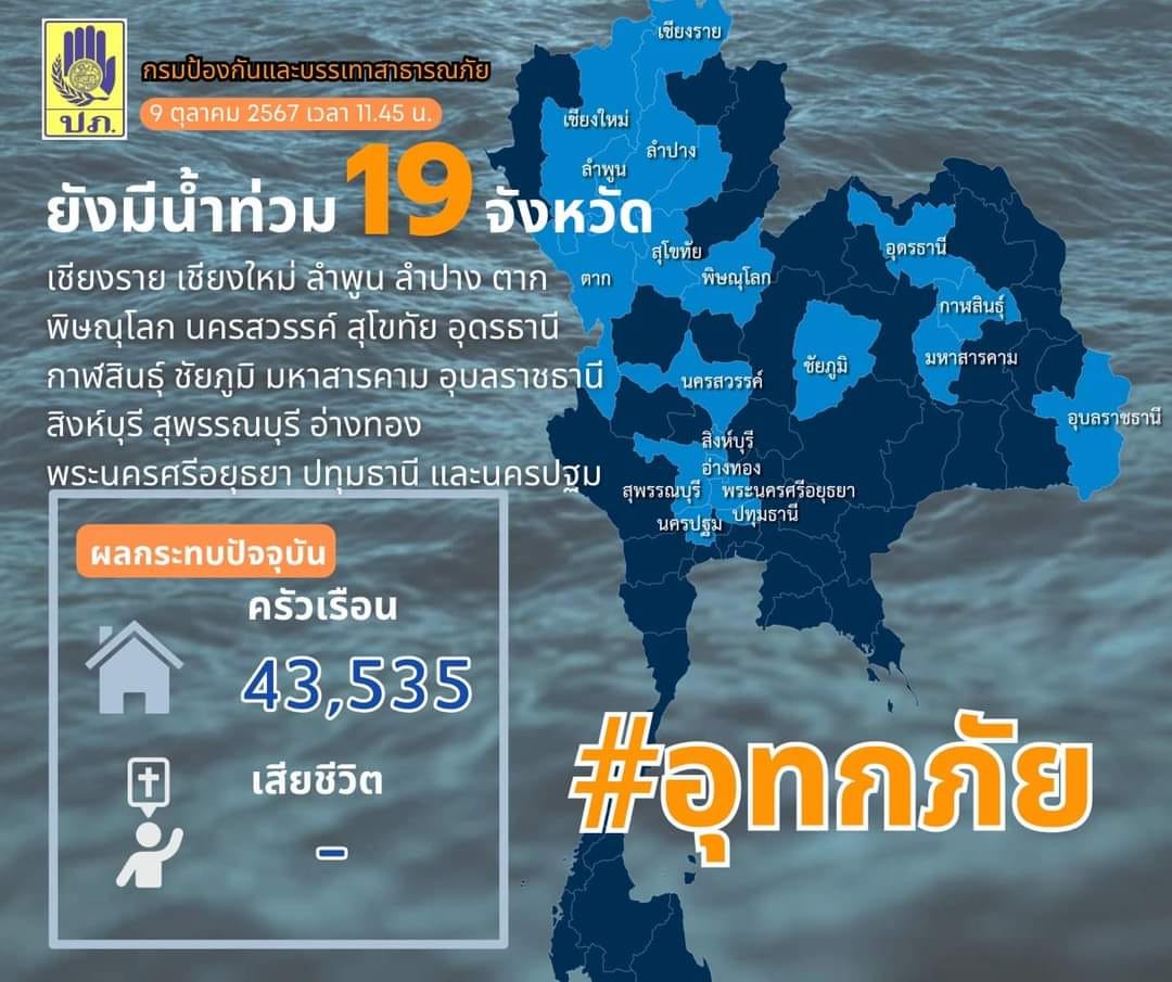 9 ต.ค. 67 เวลา 12.00 น. กรมป้องกันและบรรเทาสาธารณภัย (ปภ.) รายงานมีสถานการณ์อุทกภัยในพื้นที่ 19 จังหวัด ได้แก่ เชียงราย เชียงใหม่ ลำพูน ลำปาง ตาก พิษณุโลก นครสวรรค์ สุโขทัย อุดรธานี กาฬสินธุ์ ชัยภูมิ มหาสารคาม อุบลราชธานี สิงห์บุรี สุพรรณบุรี อ่างทอง พระนครศรีอยุธยา ปทุมธานี และนครปฐม รวม 69 อำเภอ 329 ตำบล 1,577 หมู่บ้าน ประชาชนได้รับผลกระทบ 43,535 ครัวเรือน ส่งเจ้าหน้าที่ชุดปฏิบัติการพร้อมเครื่องจักรกลสาธารณภัยระบายน้ำออกจากพื้นที่ พร้อมดูแลให้ความช่วยเหลือและบรรเทาความเดือดร้อนของประชาชนที่ได้รับผลกระทบ รวมถึงเร่งฟื้นฟูพื้นที่ที่สถานการณ์คลี่คลายให้กลับคืนสู่สภาพปกติอย่างต่อเนื่องและเต็มกำลัง