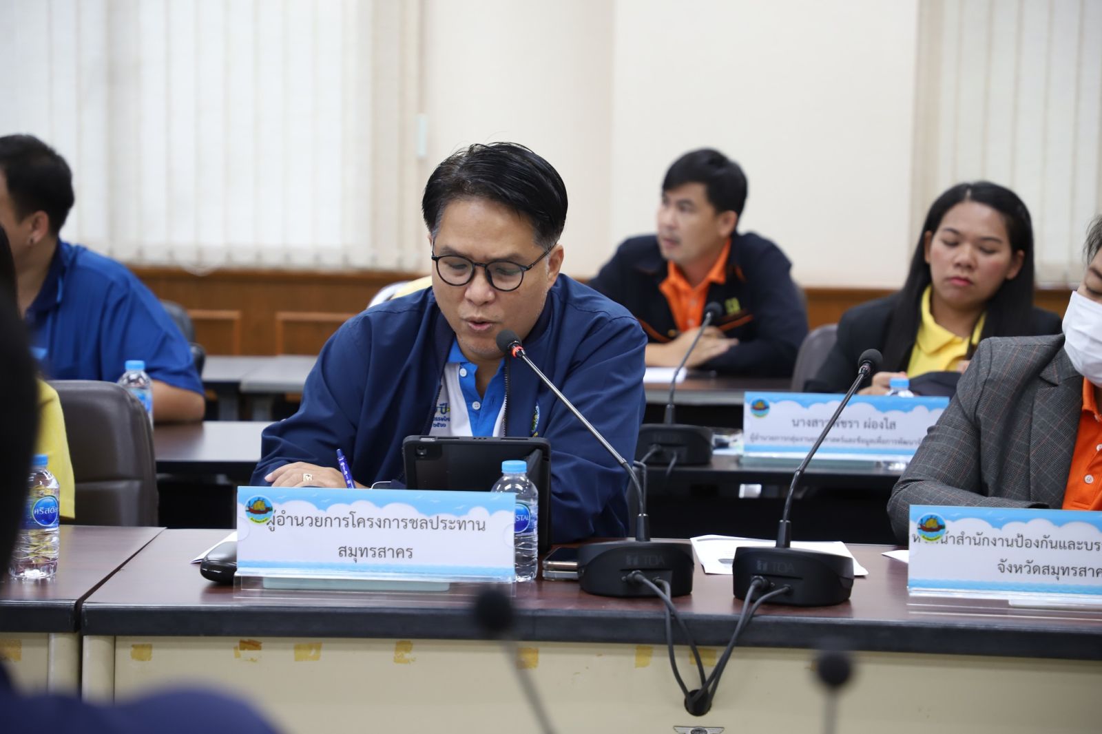 โดยในวันนี้ (10 ตุลาคม 2567) นายสกล ศักดิ์กำจร หัวหน้าสำนักงานจังหวัดสมุทรสาคร ได้เรียกหน่วยงานราชการ องค์การบริหารส่วนจังหวัดสมุทรสาคร องค์กรปกครองส่วนท้องถิ่นที่เกี่ยวข้อง เข้าร่วมประชุมหารือเพื่อเตรียมแผนงาน/โครงในการป้องกันและแก้ไขปัญหาน้ำทะเลหนุนสูงในพื้นที่บริเวณ ตำบลกาหลง และตำบลบางโทรัด อ.เมืองฯ โดยนายอุดม ไกลวัตตนุสสรณ์ นายกองค์การบริหารส่วนจังหวัดสมุทรสาคร ได้รายงานได้นำโป๊ะแมคโครเล็กเข้าดำเนินการ กําจัดวัชพืชขุดลอกคลองเกตุม และคลองกลาง มาได้ 4 วันแล้ว เพื่อเพิ่มประสิทธิภาพในการระบายน้ำ ซึ่งทีมผู้สื่อข่าวได้ลงพื้นที่ไปดูการทำงานการขุดลอกคลอง การกำจัดวัชพืชที่คลองกลาง ซึ่งก็พบว่า ในขณะนี้น้ำที่ท่วมคู่ขนานพระราม 2 ได้ลงลด และในโครงการมหาชัยแฟคตอรี่ทาวน์ได้ลดลงแล้วเหลือประมาณ 10-20 เซนติเมตรเพียงเท่านั้น
